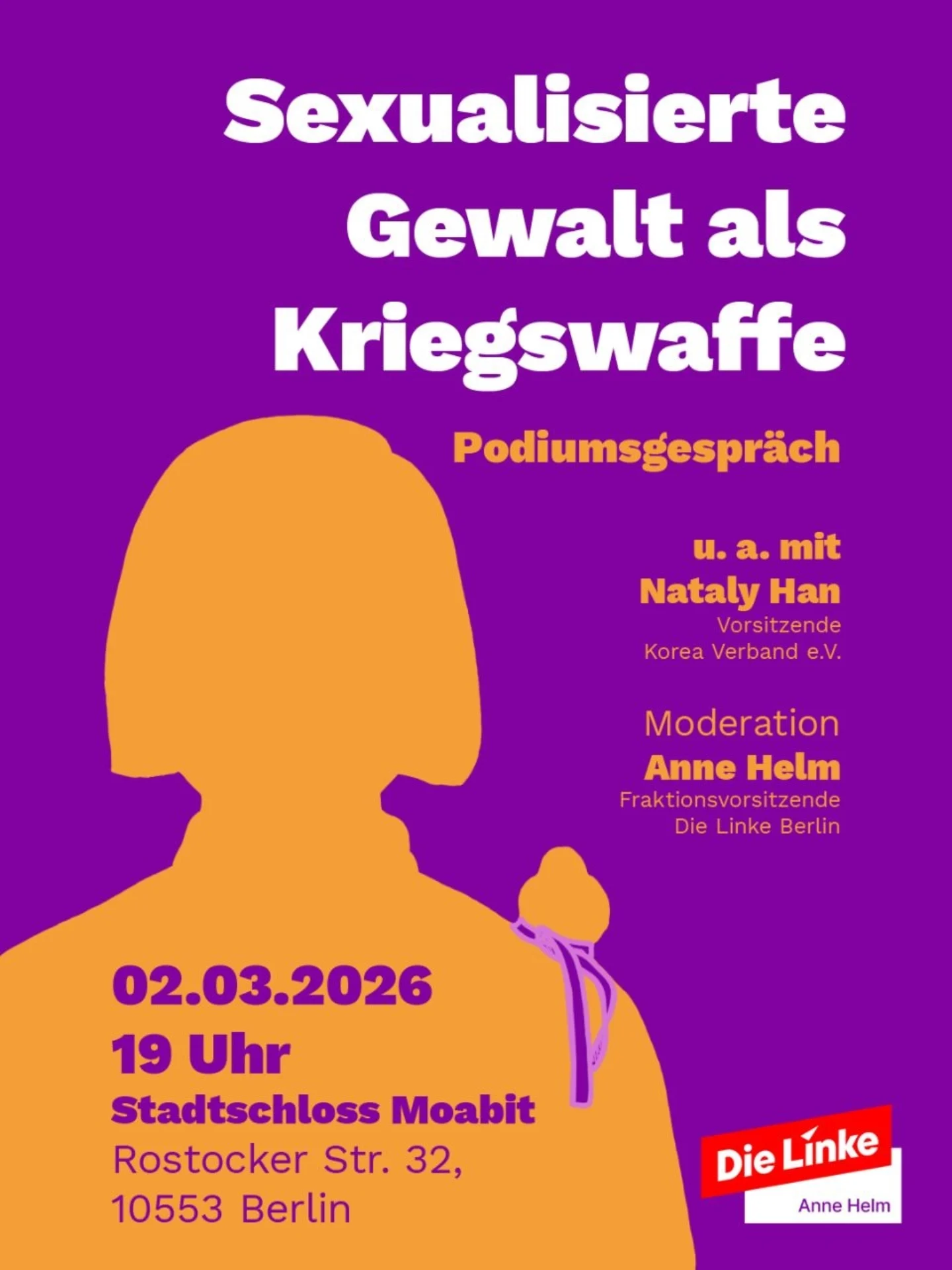 Der Veranstaltungsort ist in Moabit – ein Kiez, der sich seit Jahren für den Erhalt der Friedensstatue als Symbol gegen sexualisierte Gewalt als Kriegswaffe einsetzt.