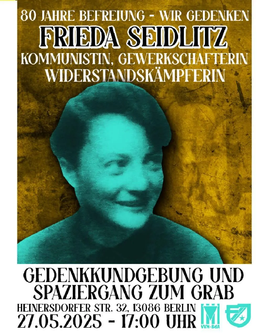 Wir laden euch zum Gedenken an die antifaschistische Widerstandskämpferin Frieda Seidlitz ein.