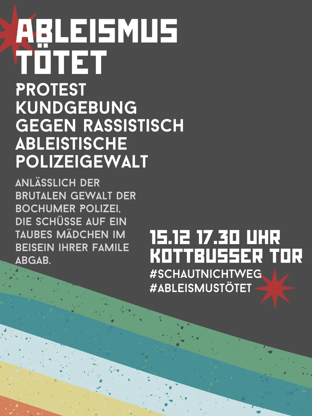 Im November wurde ein zwölfjähriges, T*taubes Mädchen in Bochum durch mehrere Schüsse der Polizei schwer verletzt. Ihre Mutter und ihr Bruder wurden von der Polizei gewaltsam fixiert und mussten die Gewalt an ihrer Tochter bzw. Schwester miterleben.