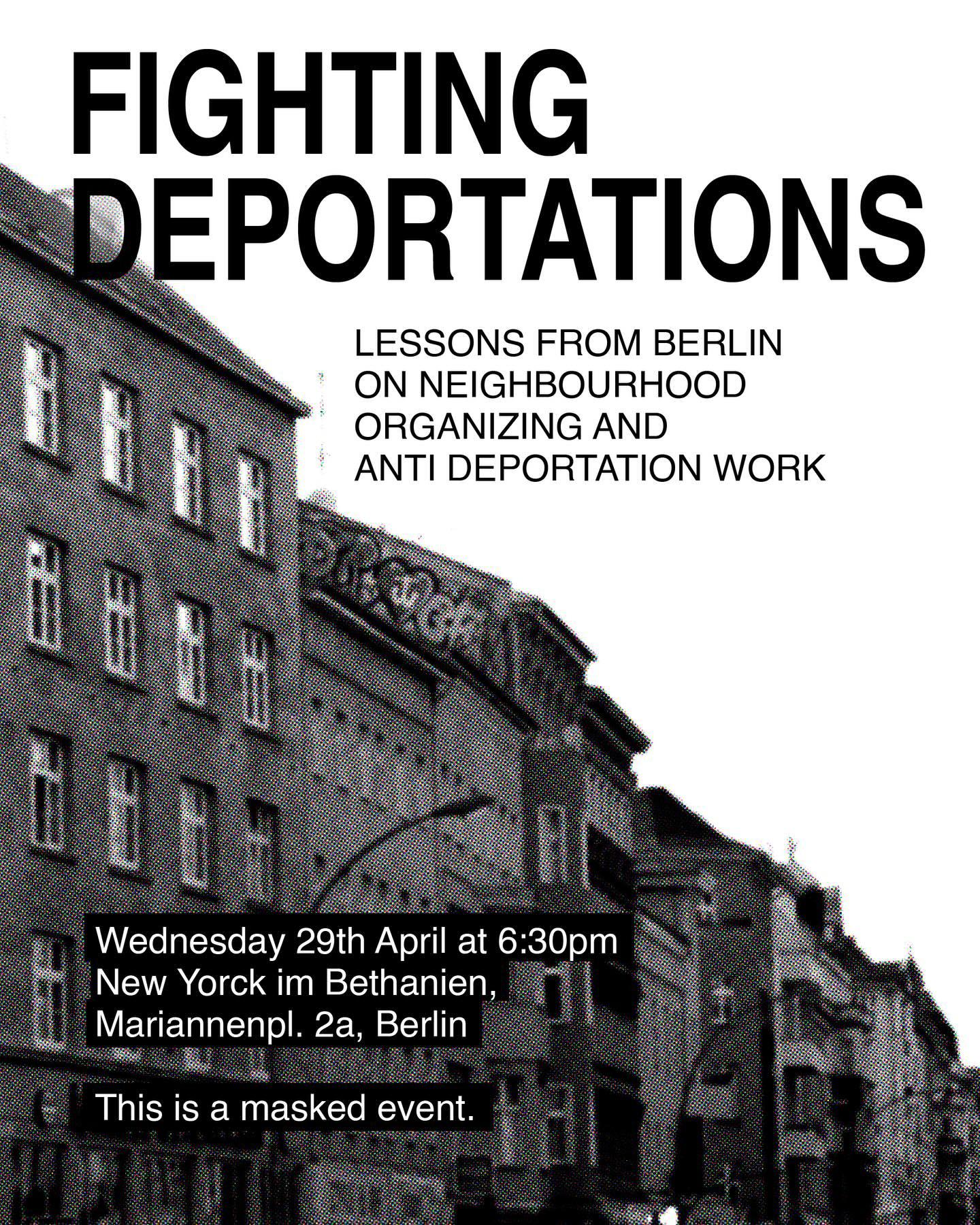 Groups from Berlin will share with us their lessons and struggles, as well as information on how deportations can be fought here. Some inputs will be on neighbourhood organizing (from Stadtteilkommittee, Lichtenrade Solidarisch…), others on anti-deportation work (from the anti-deportation hotline, International Women Space…).