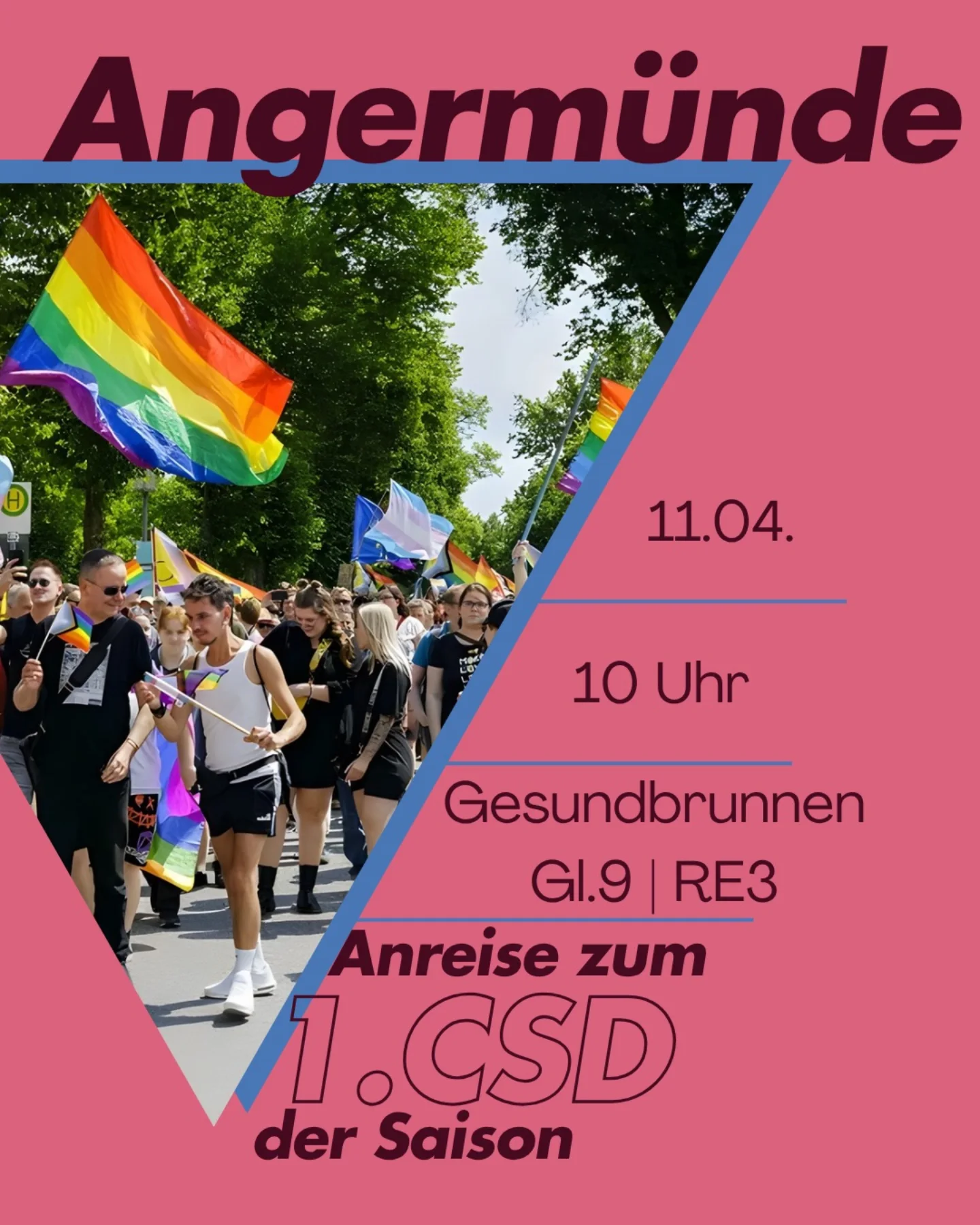 Der erste CSD des Jahres findet in Angermünde statt, wir treffen uns um 10 Uhr am Bhf. Gesundbrunnen um gemeinsam zum CSD zu fahren!