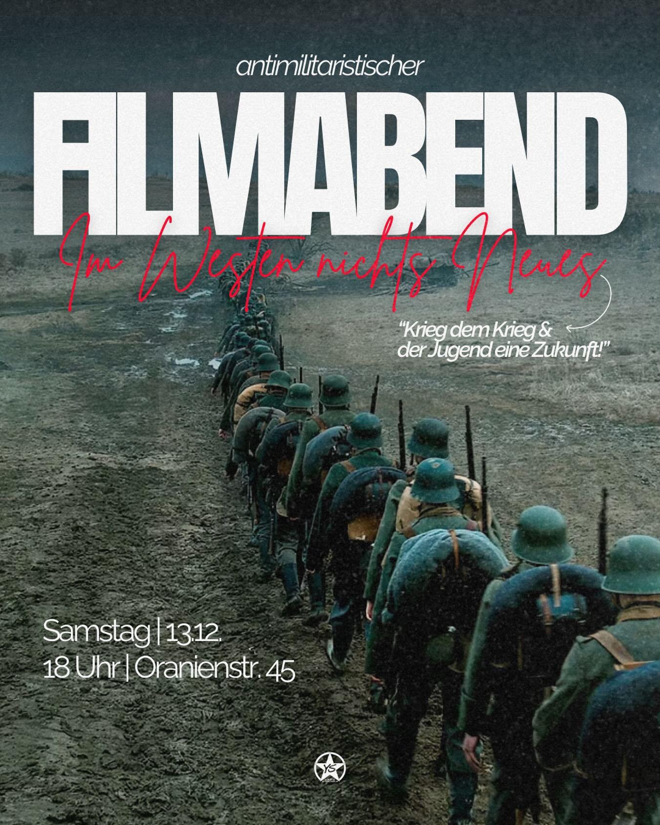 Am Samstag wollen wir zusammen kommen, den Film „Im Westen nichts Neues“ schauen und diskutieren, wie wir gegen die Wehrpflicht und die Aufrüstung aktiv werden können.