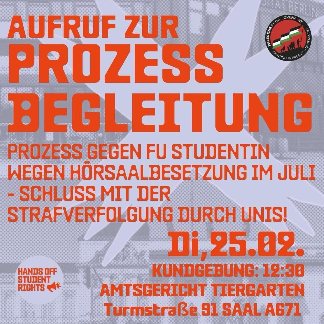 Am Dienstag steht der nächste Prozess gegen eine Studentin wegen der Hörsaalbesetzung an der FU im Juli letztes Jahr an. Die Person wird von der eigenen Universität des Hausfriedensbruch angeklagt. Doch wir wissen, dass unser Protest legitim war und ist.