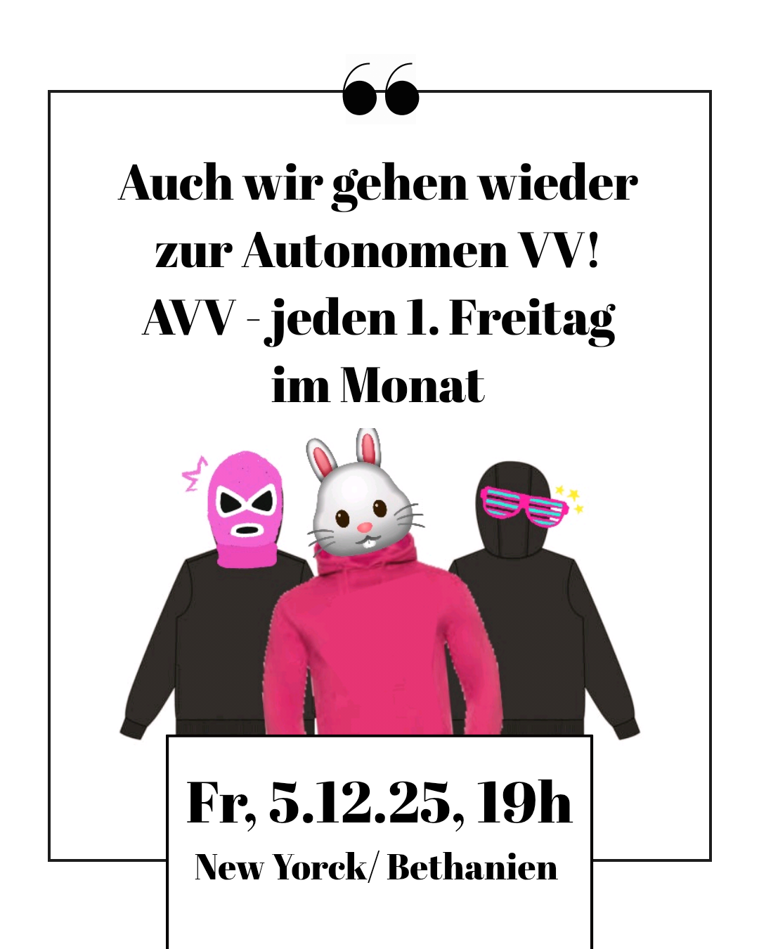 Die AVV findet immer am ersten Freitag des Monats statt und soll ein Raum sein fürs Netzwerken, Kampagnenschmieden, Auswerten und Anlaufpunkt für Organisierung.