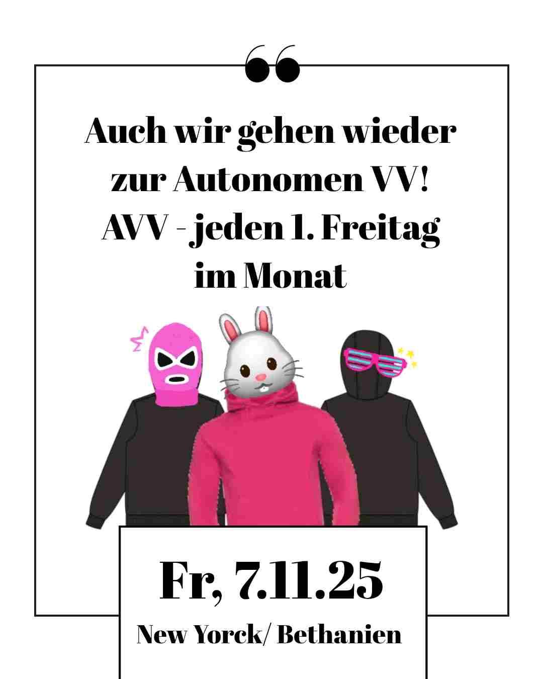 Die AVV findet immer am ersten Freitag des Monats statt und soll ein Raum sein fürs Netzwerken, Kampagnenschmieden, Auswerten und Anlaufpunkt für Organisierung.
