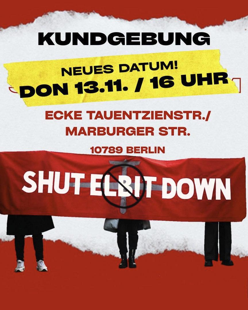 Kommt zur Kundgebung #EvictElbit vor deren Berliner Büros.