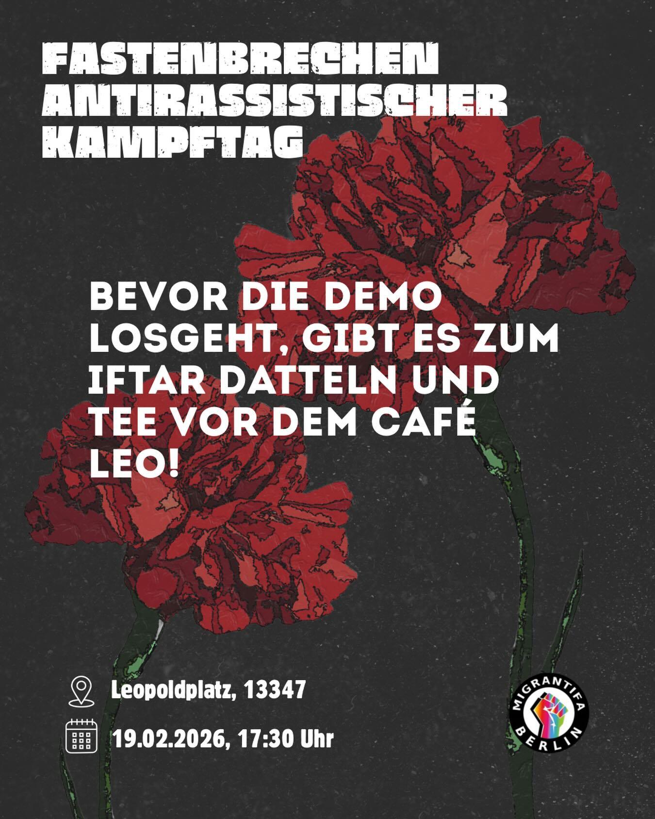 Unsere Demo zum Antirassistischen Kampftag am 19.2. fällt auf den Beginn von Ramadan, deswegen möchten wir euch zum Iftar ab 17:30 auf den Leopoldplatz einladen.