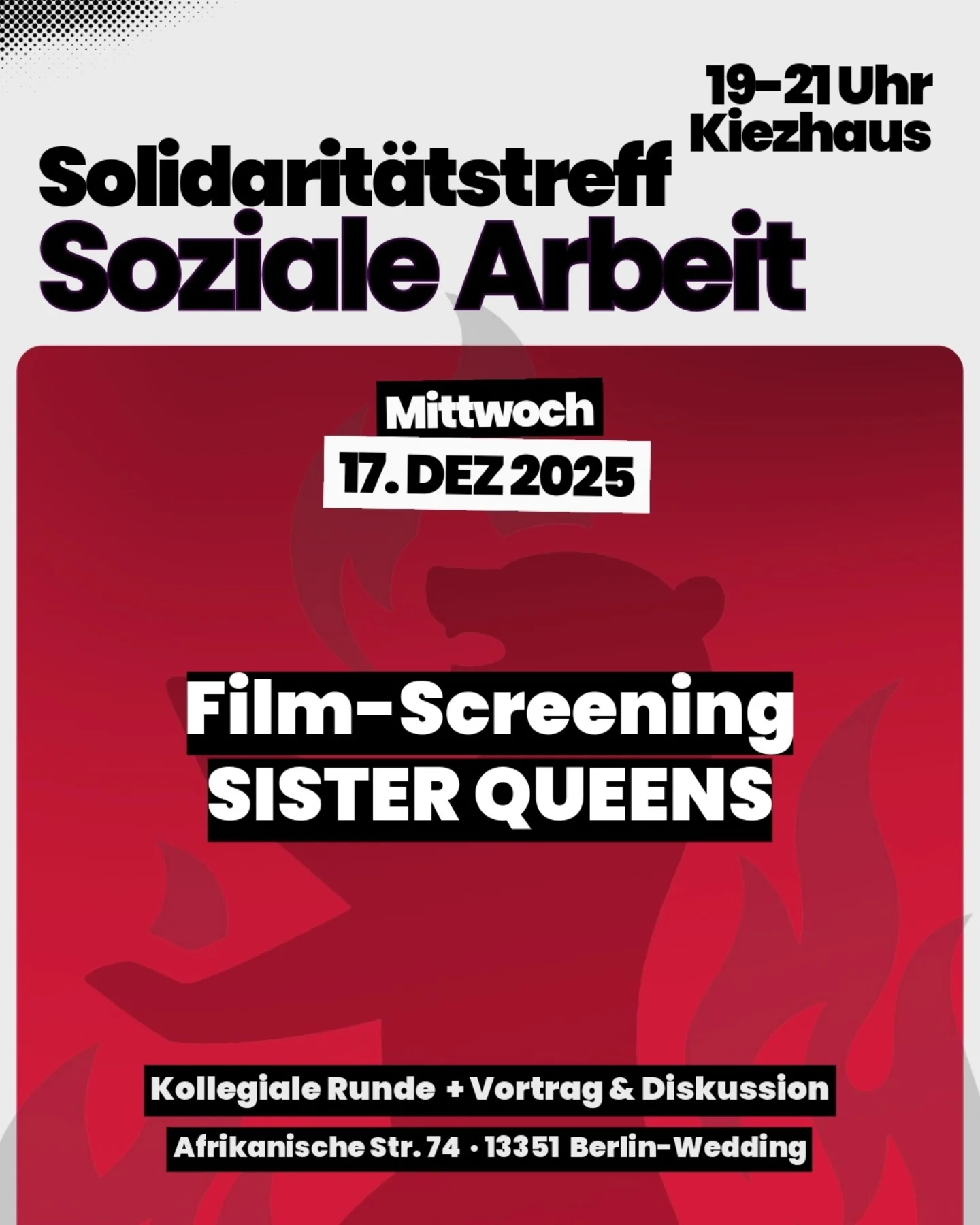 hiermit laden wir euch zum nächsten Solitreff im Kiezhaus sowie zum Film-Screening ‚Sister Queens‘ ein.