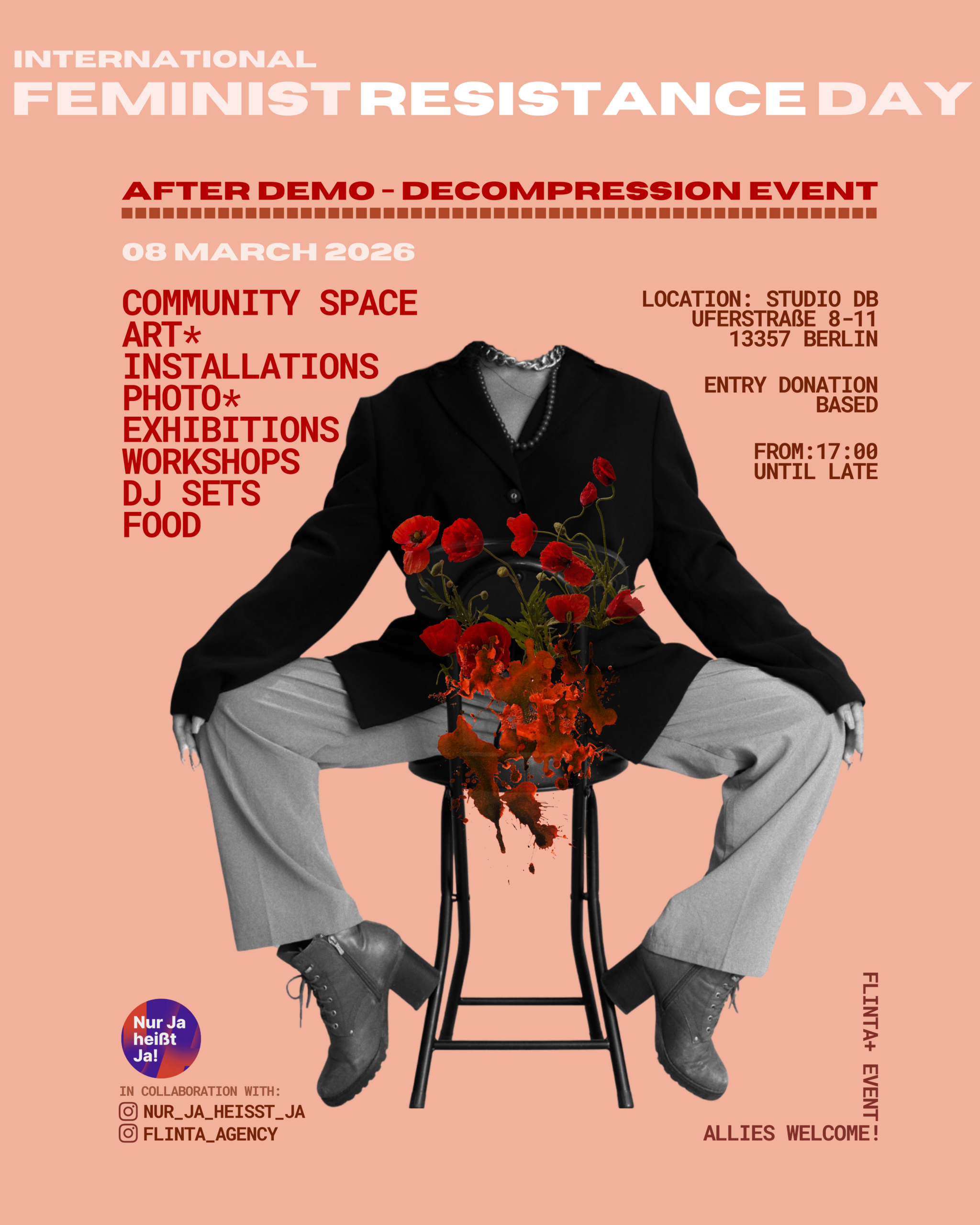Following the emotional and loud demonstration, we welcome FLINTA + Allies from 17:00 onwards to Studio dB for a warm, grounding space to arrive, rest, and reconnect, with a buffet, installations, exhibition space, info stands and a cosy community-oriented atmosphere, music.