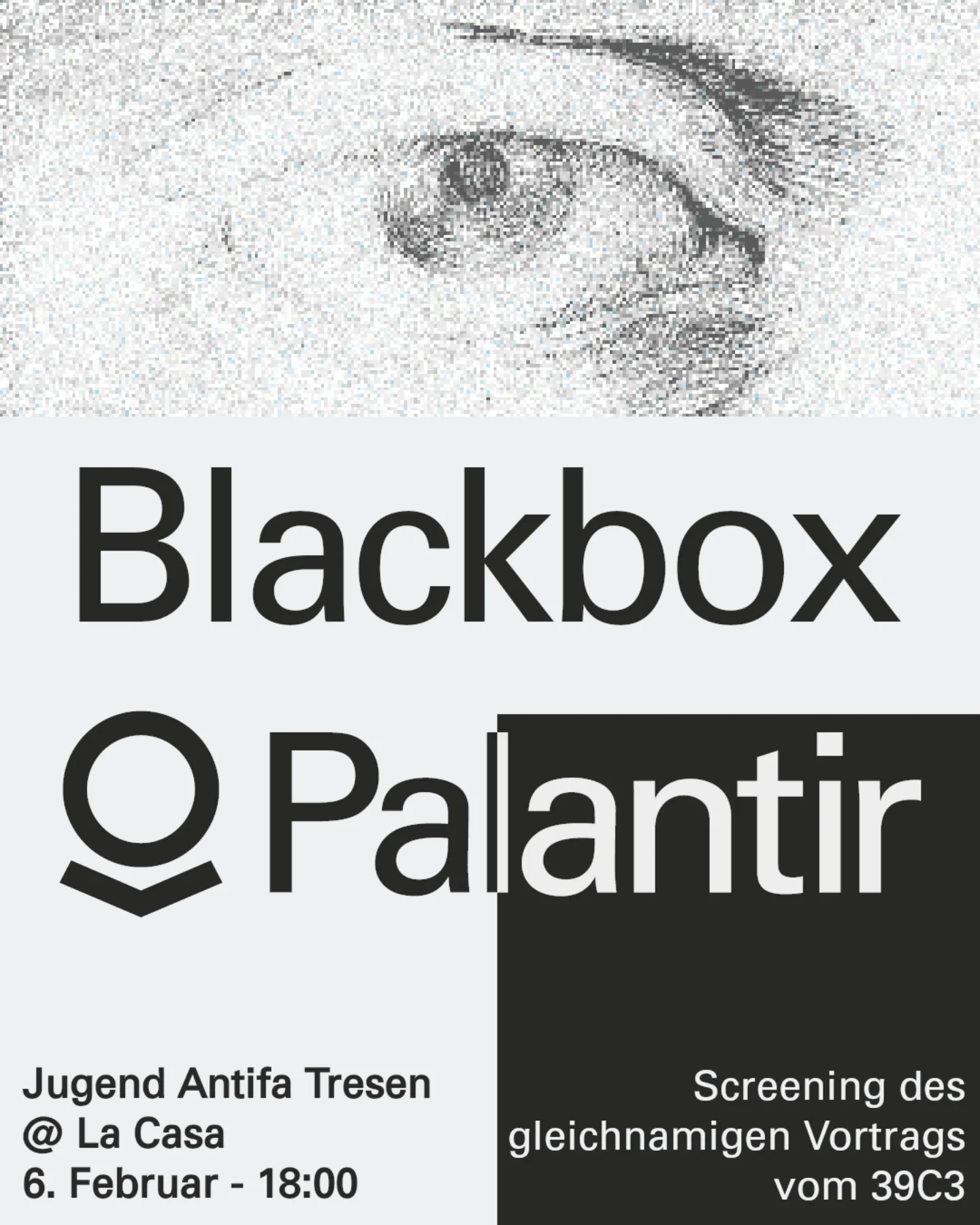 Beim Jugendantifa Tresen am 6.2. laden wir euch ein, gemeinsam den Vortrag „Blackbox Palantir“ vom Chaos Communications Congress zu schauen und zu besprechen.