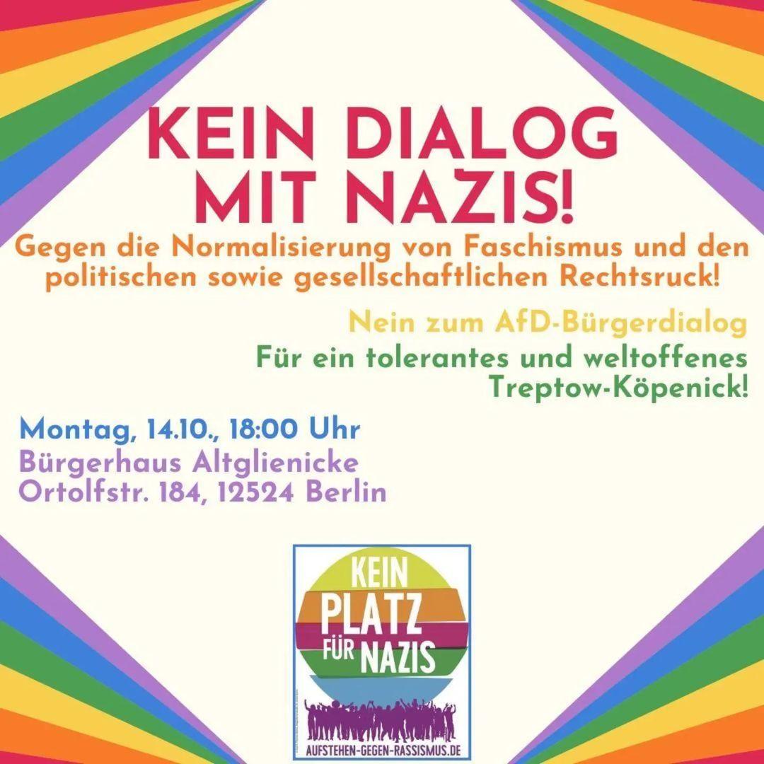 Kommt am Montag, den 14. Oktober, um 18:00 Uhr zum Bürgerhaus Altglienicke (Ortolfstr..184, 12524 Berlin) und setzt mit uns ein Zeichen gegen die AfD-Nazis und ihren „Bürgerdialog“!