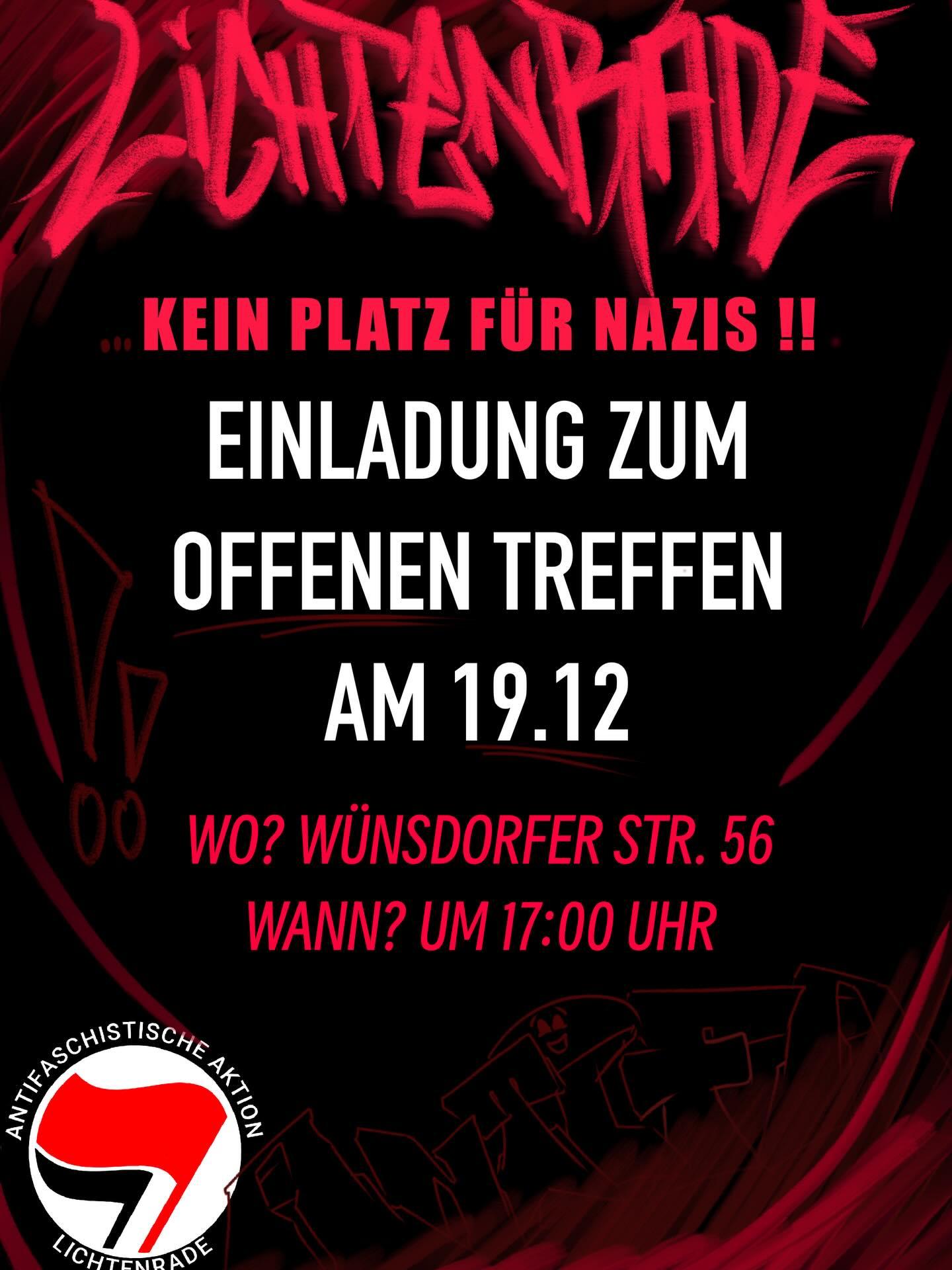Deshalb haben wir die Antifa Lichtenrade gegründet. Am 19.12.2025 wollen wir um 17:00 Uhr ein offenes Treffen in den Räumen von Lichtenrade Solidarisch in der Wünsdorfer Straße 56 durchführen, um dort mit euch ins Gespräch zu kommen.