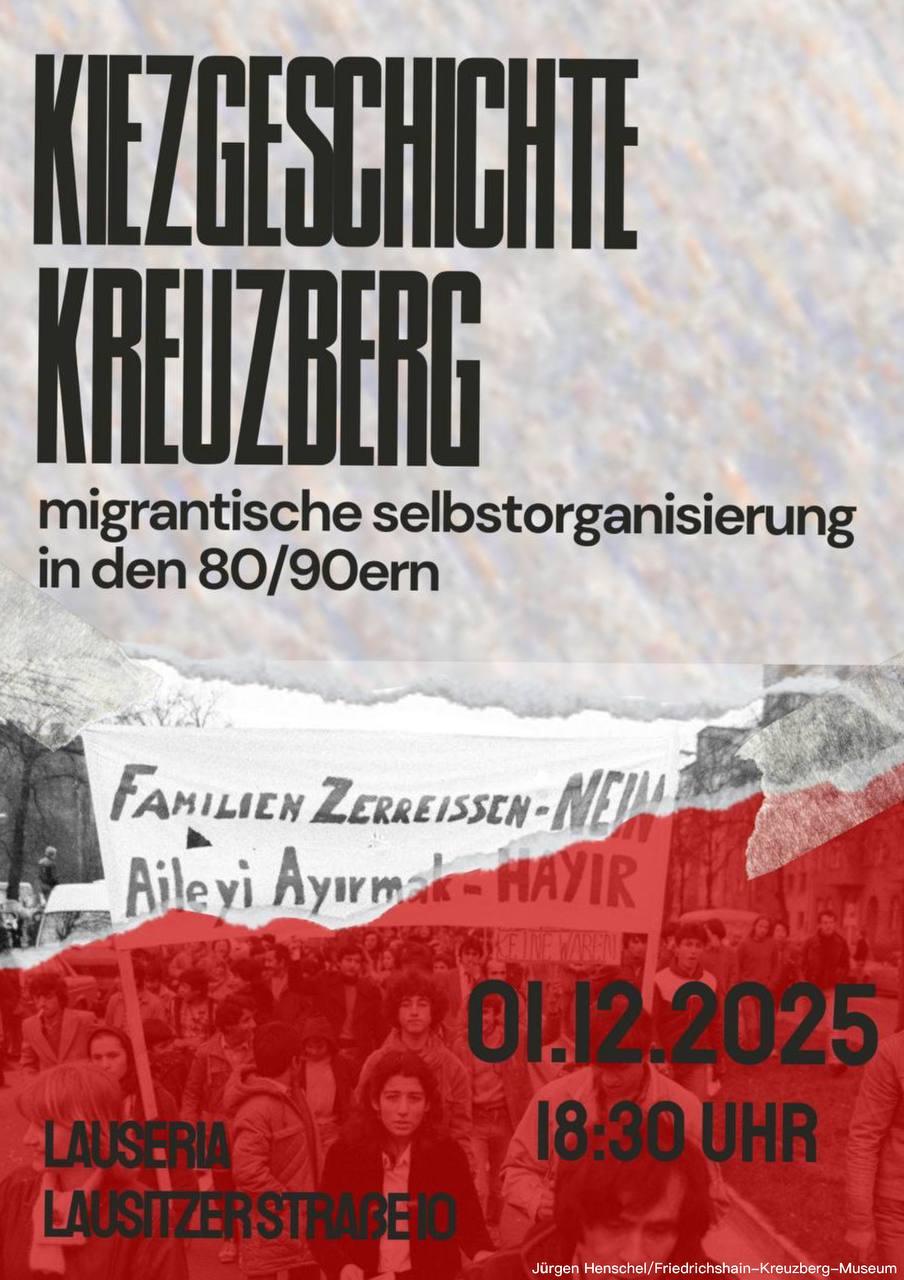 Am 1.12 um 18:30Uhr wollen wir in der Lauseria die migrantische Selbstorganisation in Kreuzberg der 80er- und 90er-Jahre in den Fokus rücken – eine Zeit, in der viele Genoss*innen sich inmitten von Widerständen und Herausforderungen politisch organisierten und kämpften.