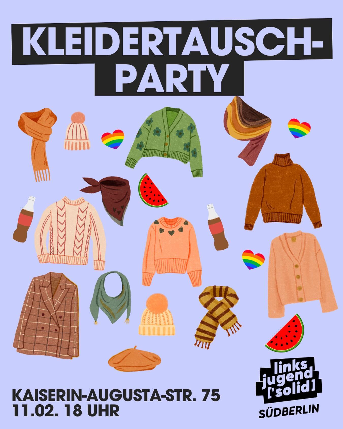 Kommt zu unserer Kleidertauschparty am 11.02 in der Kaiserin-Augusta-Str. 75 ab 18 Uhr.
