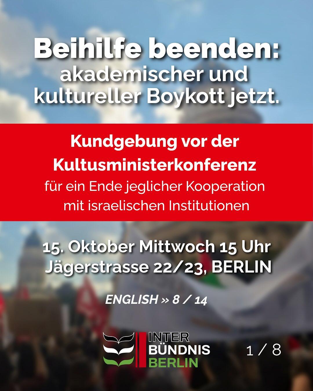 A full institutional boycott of Israeli institutions, including in culture and science. We will resolutely bring this demand to the Conference of Ministers of Education, which will meet in Berlin on October 14-15.
