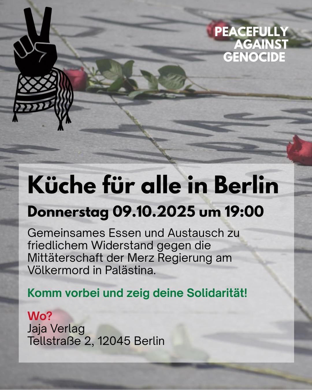 ❤️ Wir laden euch ein, gemeinsam zu essen, neue Menschen kennenzulernen und euch über gewaltfreien Widerstand gegen die Mittäterschaft der Merz-Regierung am Völkermord in Palästina auszutauschen.