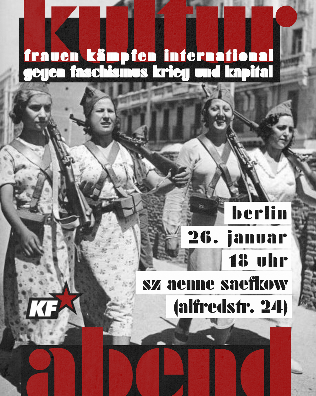 Überall da, wo sich der Faschismus herum schlängelt, überall da, wo die Widersprüche des Imperialismus immer größer werden, überall da, wo die Ketten des Imperialismus anfangen brüchig zu werden. Überall da sind und waren es eben unsere Klassenschwestern, die vorantreibend in Bewegungen hineinwirkten – mit Schlagkraft, mit Stärke in proletarischen sowie nationalen Befreiungskämpfen, in Bürgerkriegen, in revolutionären Organisationen und vielen mehr.