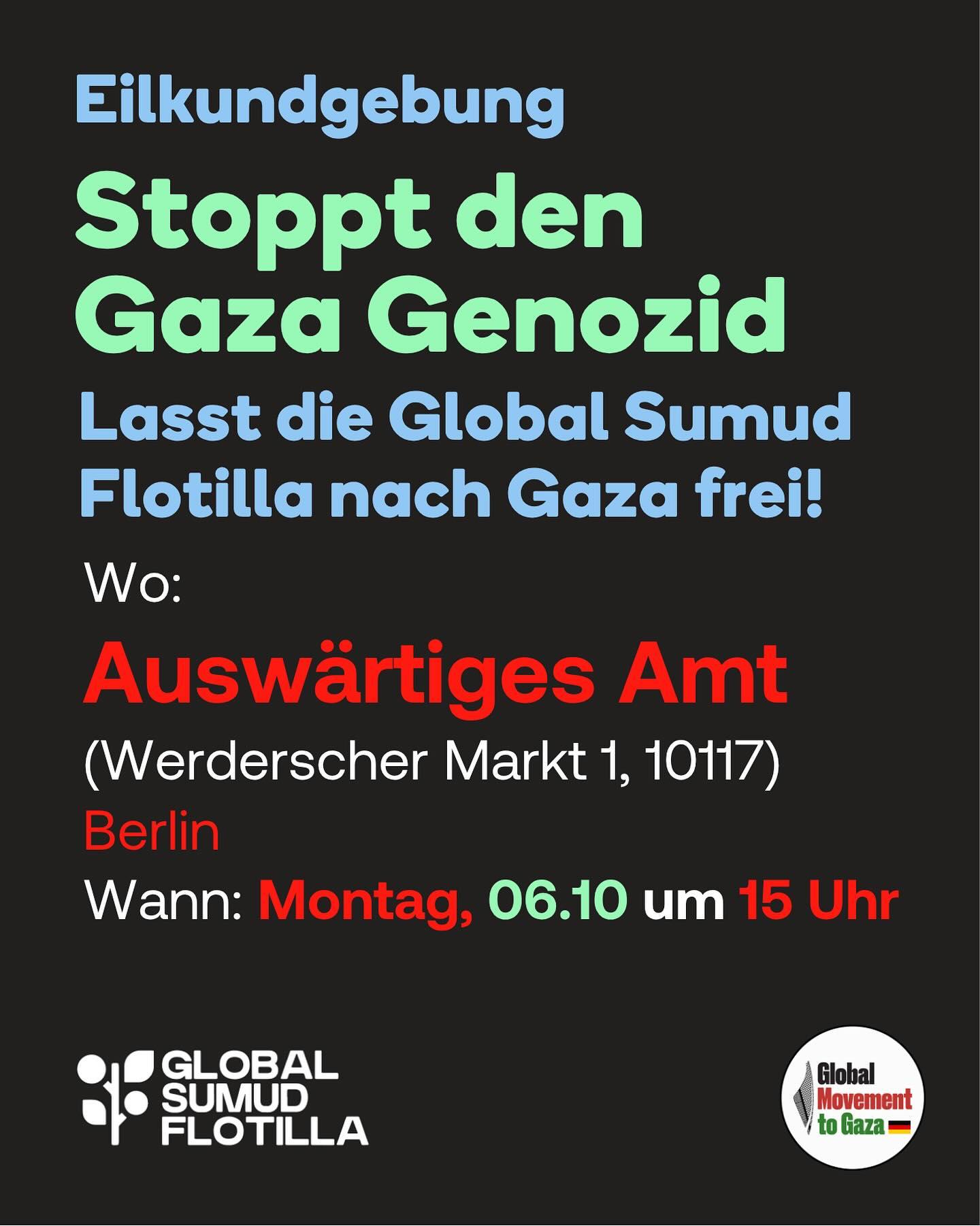 We say: Release the activists of the Sumud Flotilla and allow aid supplies to Gaza immediately! Free Palestine! Arms embargo now!