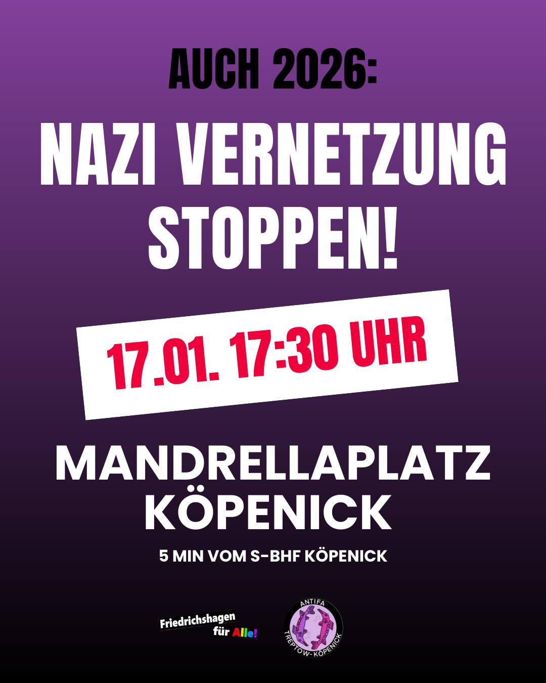 Come to Mandrellaplatz in Köpenick on 17 January at 5.30 p.m. for a broad and determined protest against the Nazi concert and their gathering in our neighbourhood. Dress warmly and bring signs and banners against the right wing.