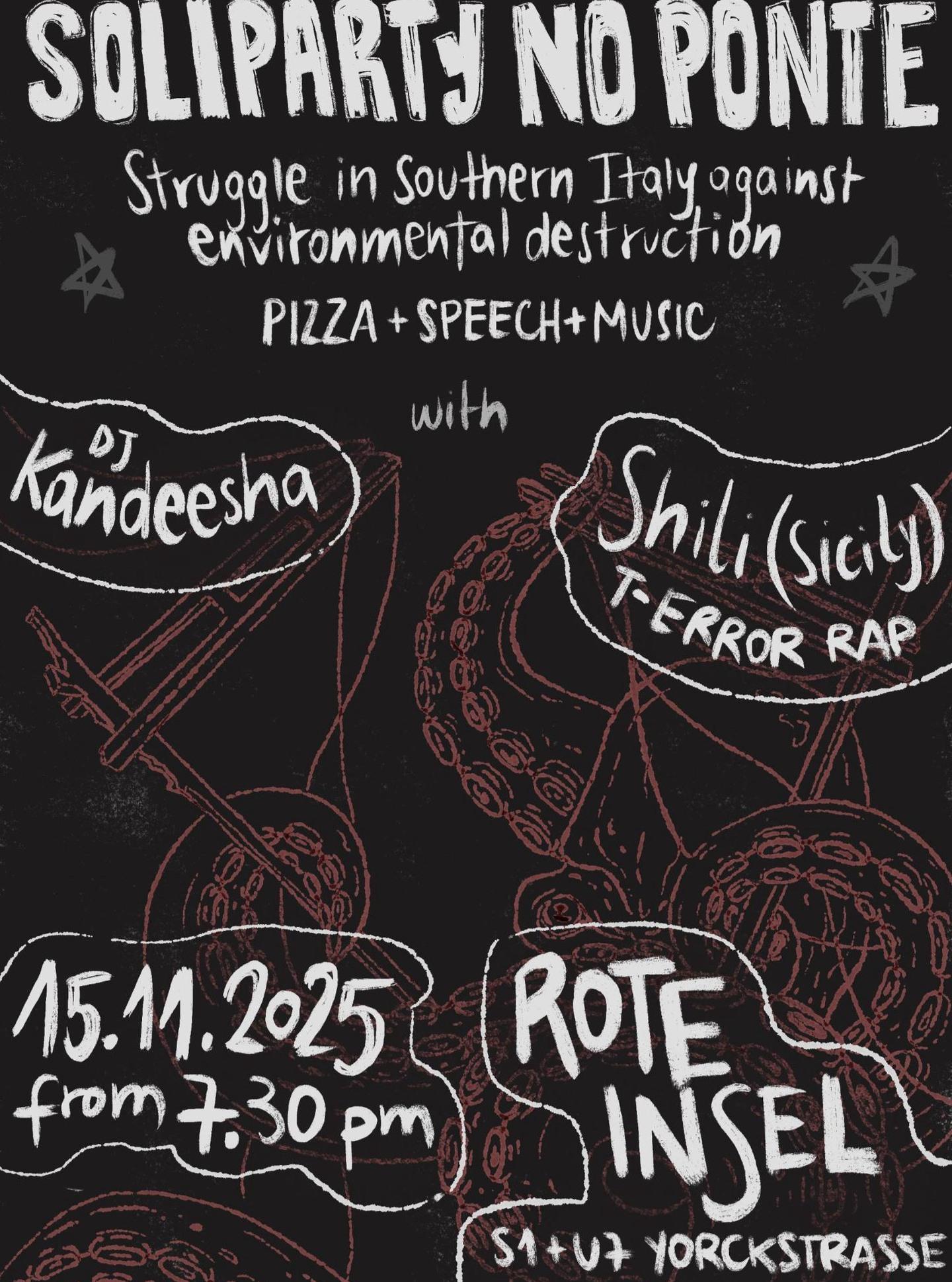 With some comrades from Messina, we will discuss this infrastructure project and its social and environmental impact. We will also talk about state repression and the „No Bridge“ movement, which has been organizing and fighting in Messina for some years.