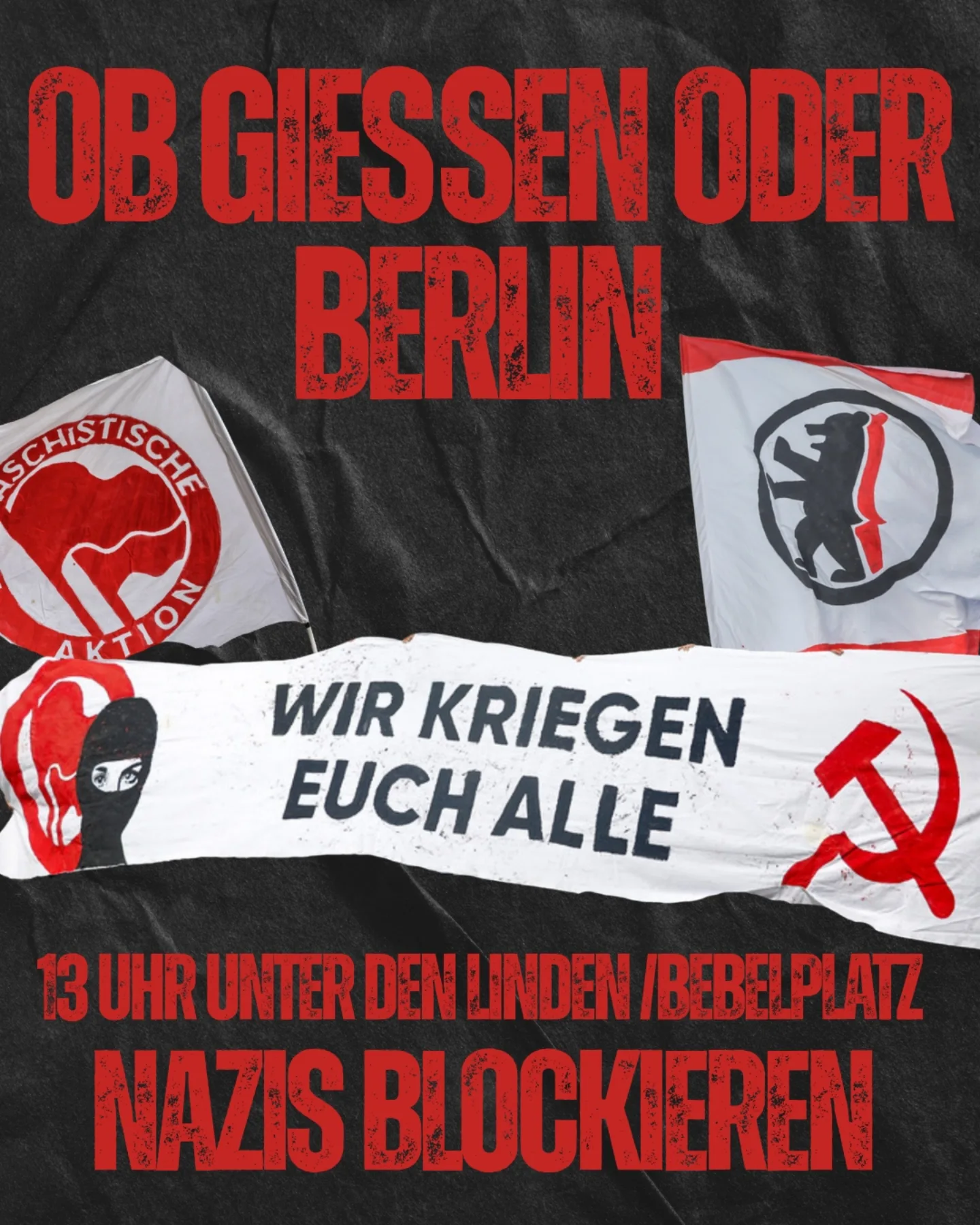 Ob in Gießen den Nazis auf der Neugründung der Afdjugend oder in Berlin der Demonstration der alten Kadernazis von der Heimat ehemals NPD, die sich mit den gewaltbereiten Sufffaschos der Deutschen Jugend Voran zusammengeschlossen haben.
