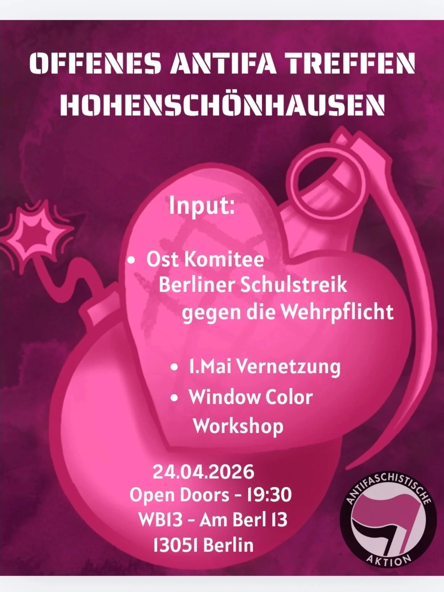 Kommt vorbei, stellt eure Fragen & connectet euch mit Ostberliner Antifas & Antimilitarist:innen, um zusammen zum nächsten Schulstreik am 08. Mai auf die Straße zu gehen und darüber hinaus antimilitaristisch aktiv zu werden.