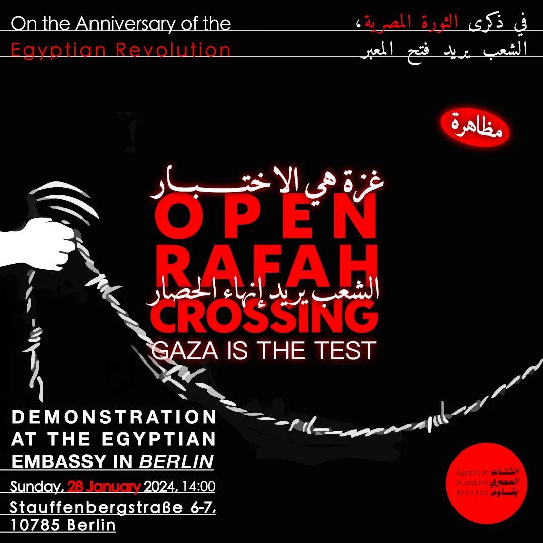 13 years after the beginning of the Egyptian revolution, we are taking a stand to send a clear message: We utterly denounce the Egyptian regime’s complicity in the genocide of our People in Palestine, by maintaining the siege over Gaza, and refusing to exercise its sovereignty over the Rafah crossing, the Egyptian-Palestinian border.