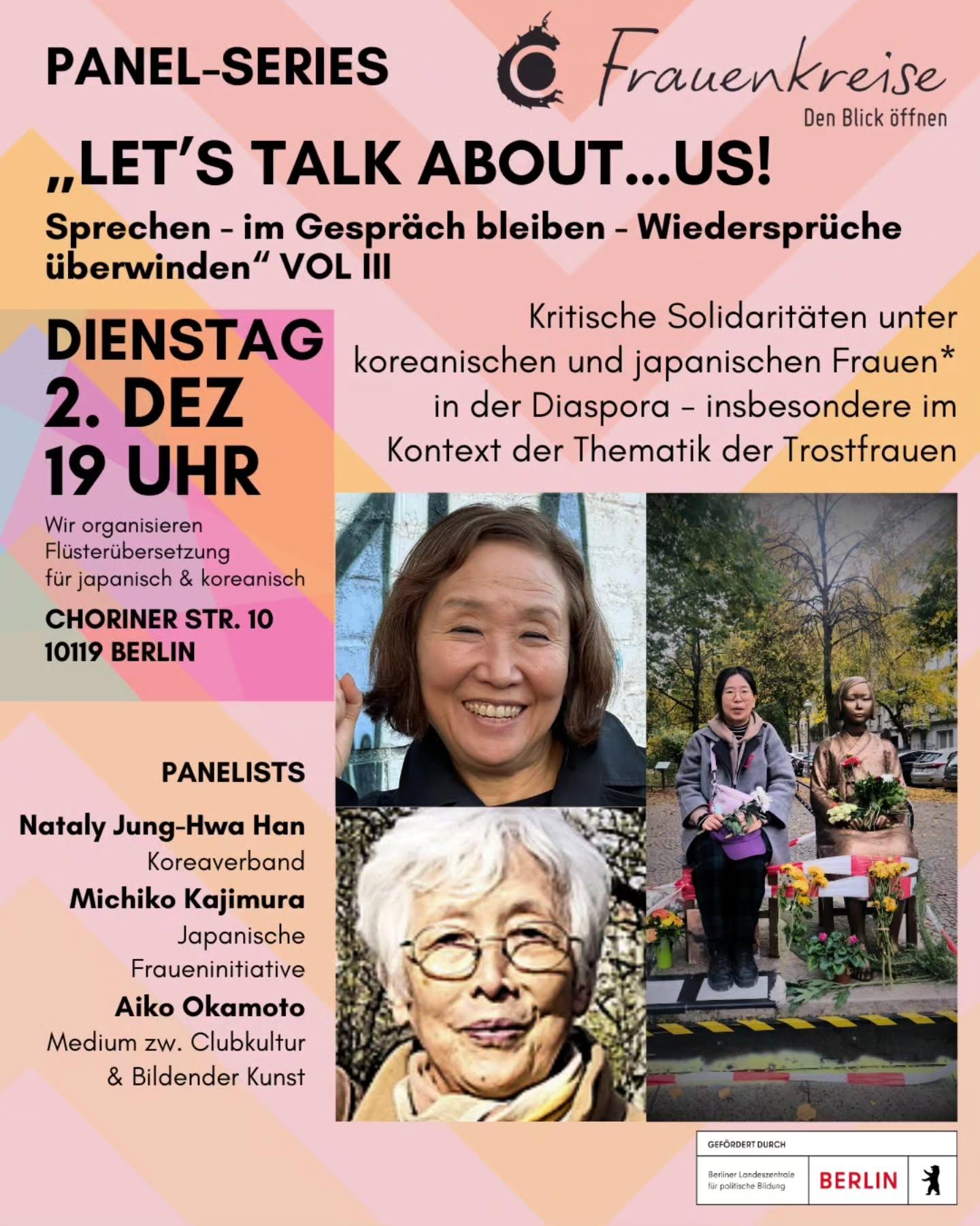 In VOL III der Reihe am 2. Dezember 2025 reflektieren koreanische und japanische Frauen* kritisch historische Machtverhältnisse untereinander, insbesondere im Kontext der Geschichte der sogenannten “Trostfrauen”.
