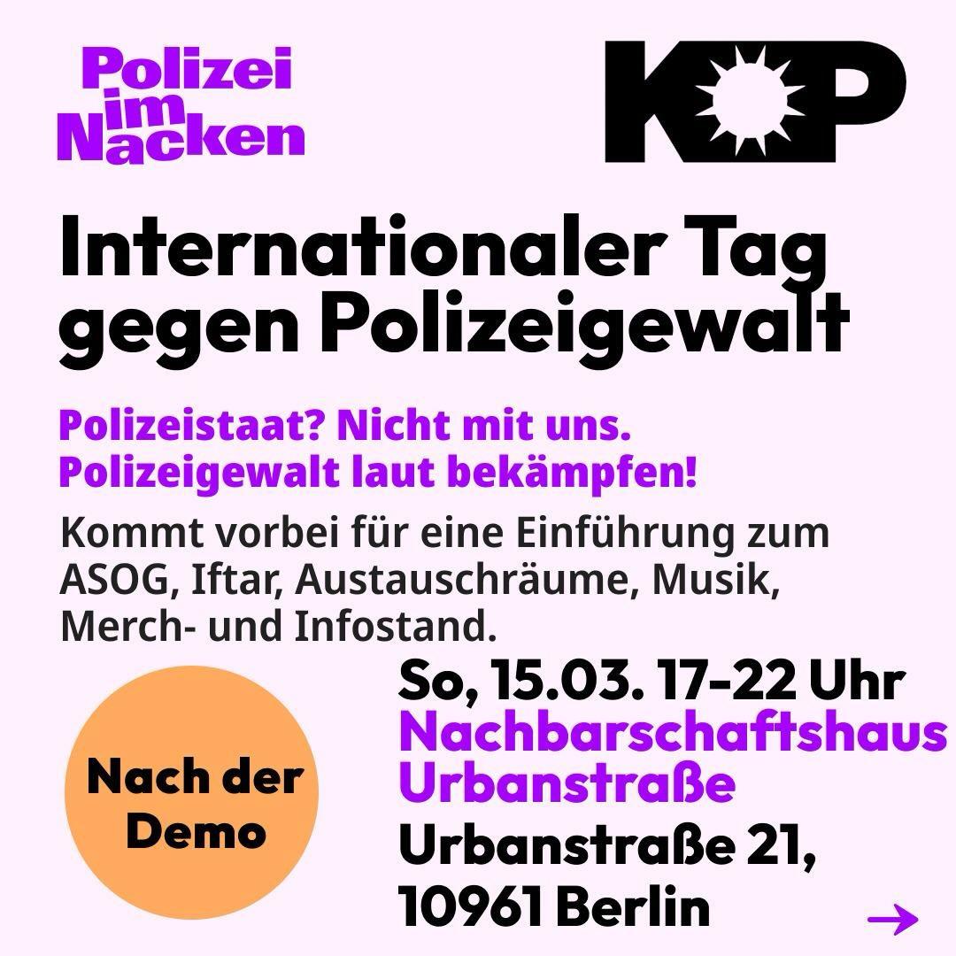 The event will conclude with music by Tausi @souljahsista_berlin and an opportunity to learn about the alliance ‘Polizei im Nacken – Kniefixierung verbieten’ (Police on Your Neck – Ban Knee Restraints) and KOP.