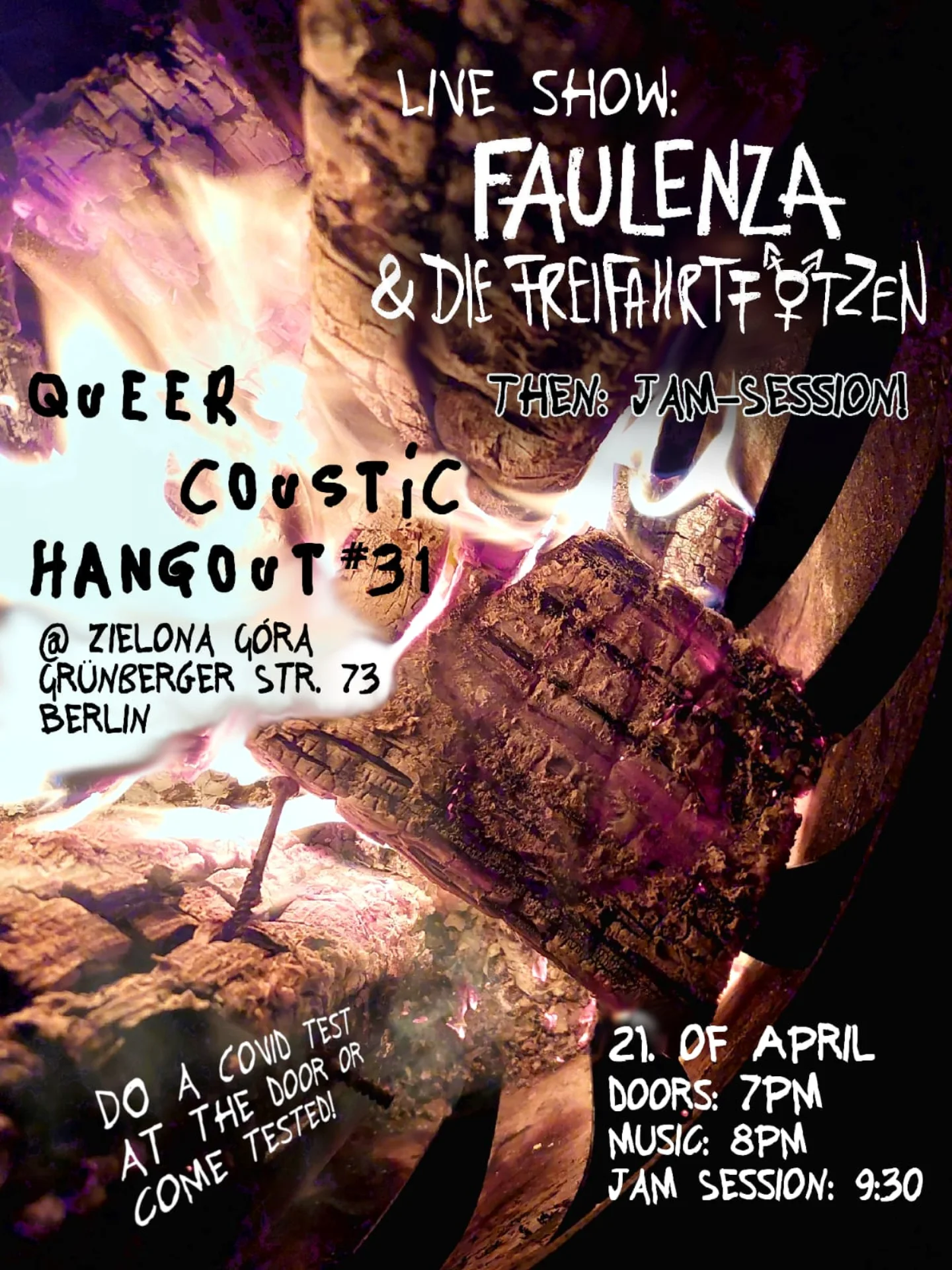 Covid existiert immer noch, bitte kommt getestet oder testet euch an der Tür mit einem von uns kostenlos zur Verfügung gestellten Test.