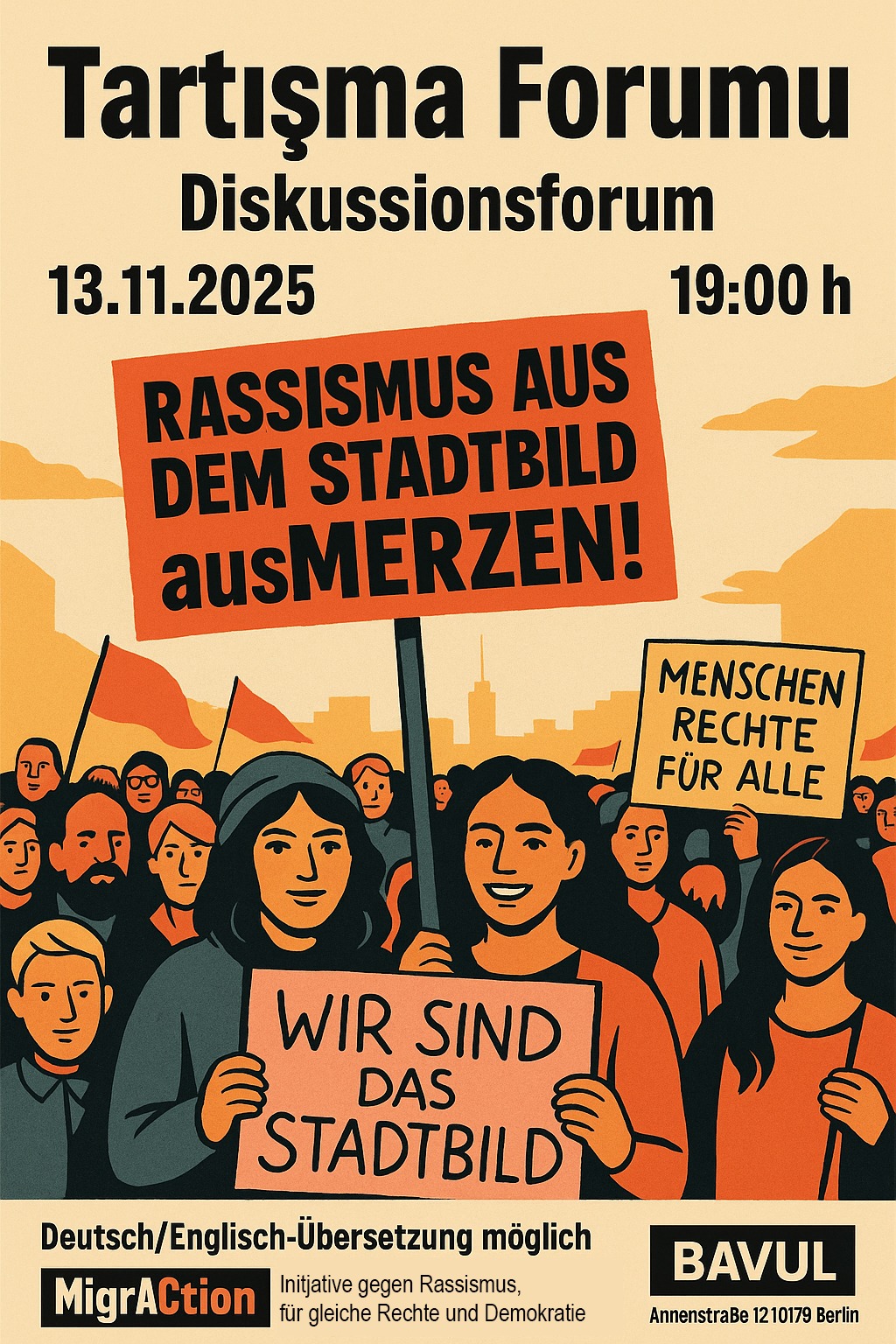 Against this backdrop, we would like to discuss this with you at the FORUM organised by our initiative MigrAction and jointly determine how we can shape and enrich the struggle for the complete elimination of racism (ausMerzen) in order to move closer to the goal of an equal, democratic and solidarity-based society.