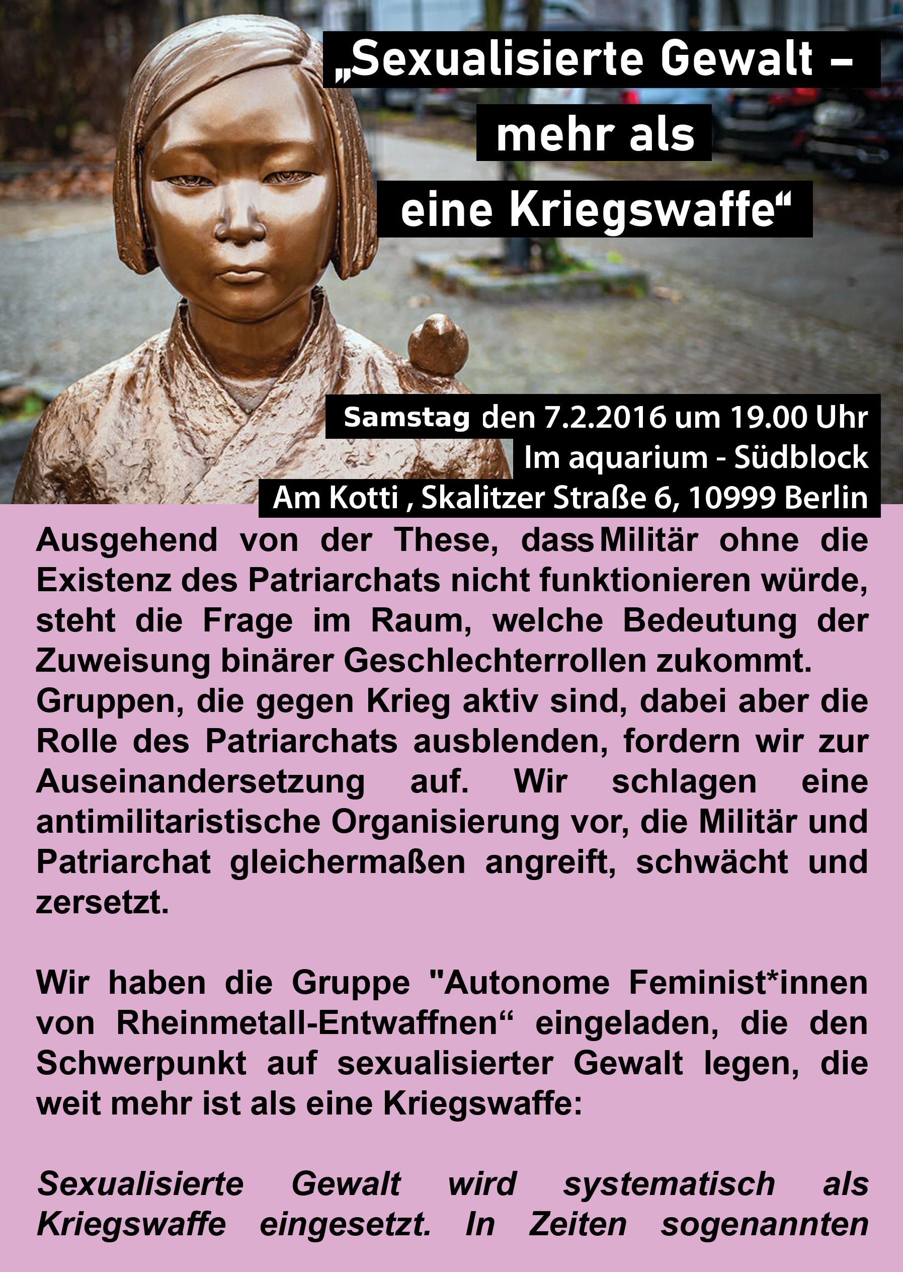 Sexualisierte Gewalt ist eine Struktur zur Aufrechterhaltung patriarchaler Machtverhältnisse. Der Diskurs gegen Krieg und Militarisierung muss diese Strukturen thematisieren und bekämpfen, damit eine reale Friedensperspektive für alle Menschen entstehen kann.