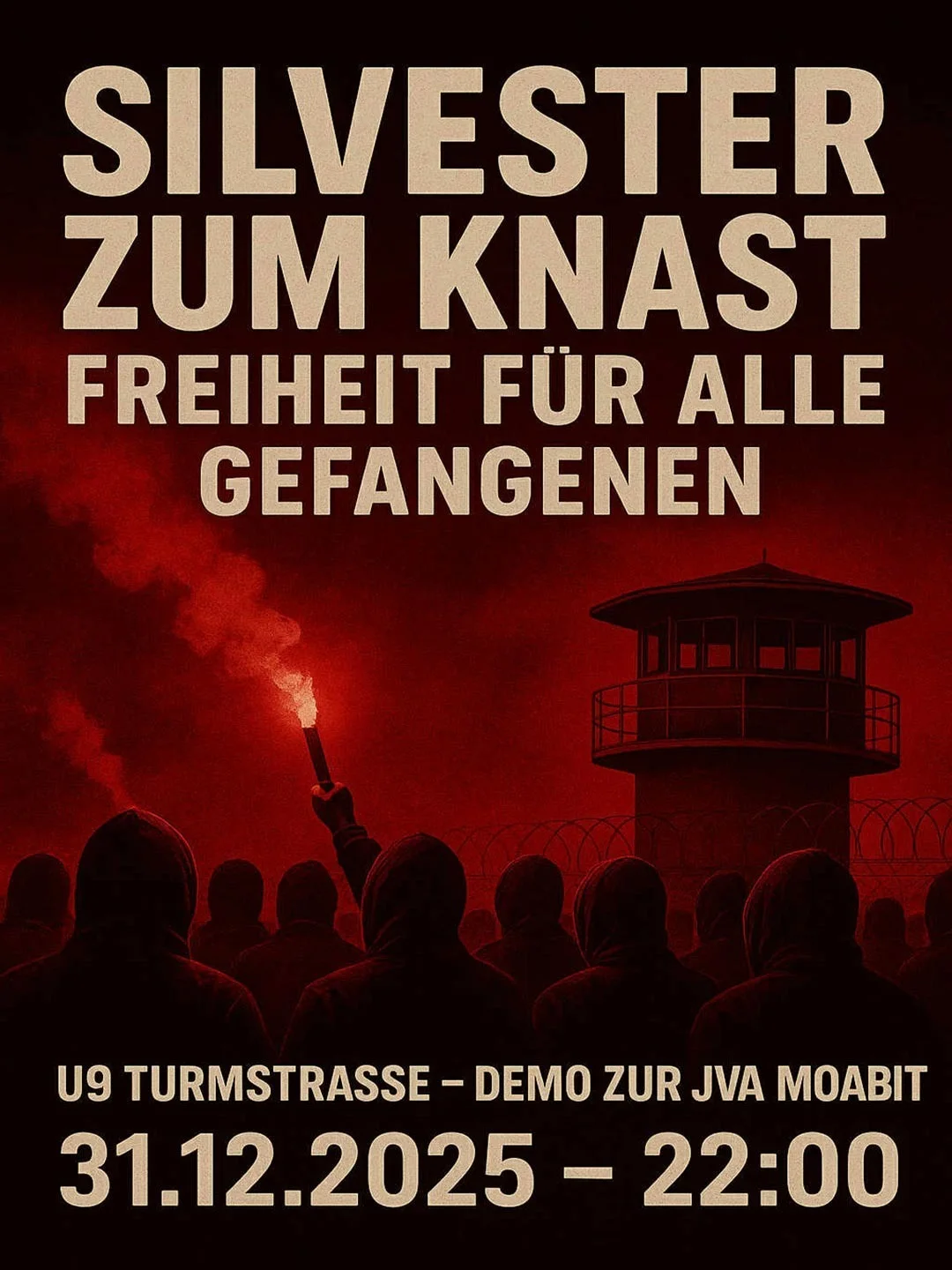 Draußen Feuerwerk – drinnen Gitter. Während die Stadt das neue Jahr mit Böllern und Sekt begrüßt, sitzen hinter Mauern Menschen in Isolation – eingesperrt wegen Armut, der Kriminalisierung von Flucht oder Widerstand. Draußen wird gefeiert, drinnen herrschen Kontrolle und Repression.
