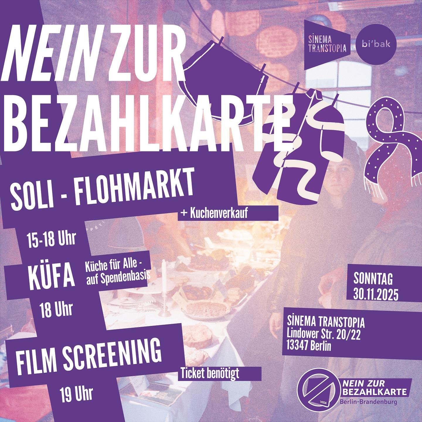 Support the fight against the Bezahlkarte by joining us from 15:00 onwards. Feel free to bring your old clothes and homeware and browse a selection of second-hand goods. If you want to inform yourself about the Bezahlkarte, this is the time and place to do that with a hot drink and a tasty slice of cake.