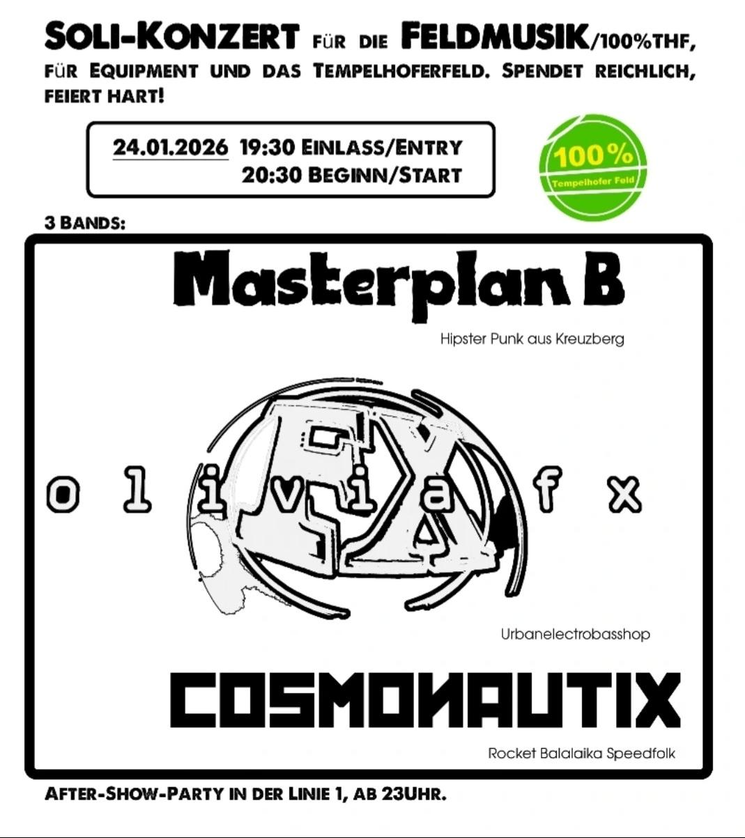 On Saturday at 8:30 p.m., there will be a solidarity concert for 100% Tempelhofer Feld, across the street from the Willy-Brandt-Haus (ahem), with an afterparty next door at Linie Eins.
