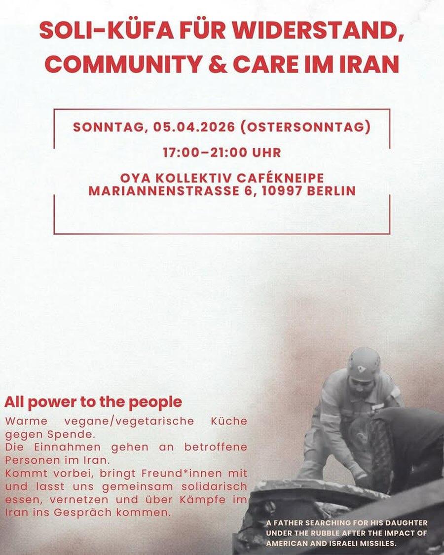 Kommt vorbei, bringt Freund*innen mit und lasst uns gemeinsam solidarisch essen, vernetzen und über Kämpfe, Arbeitskämpfe, Repression und Widerstand im Iran ins Gespräch kommen.
