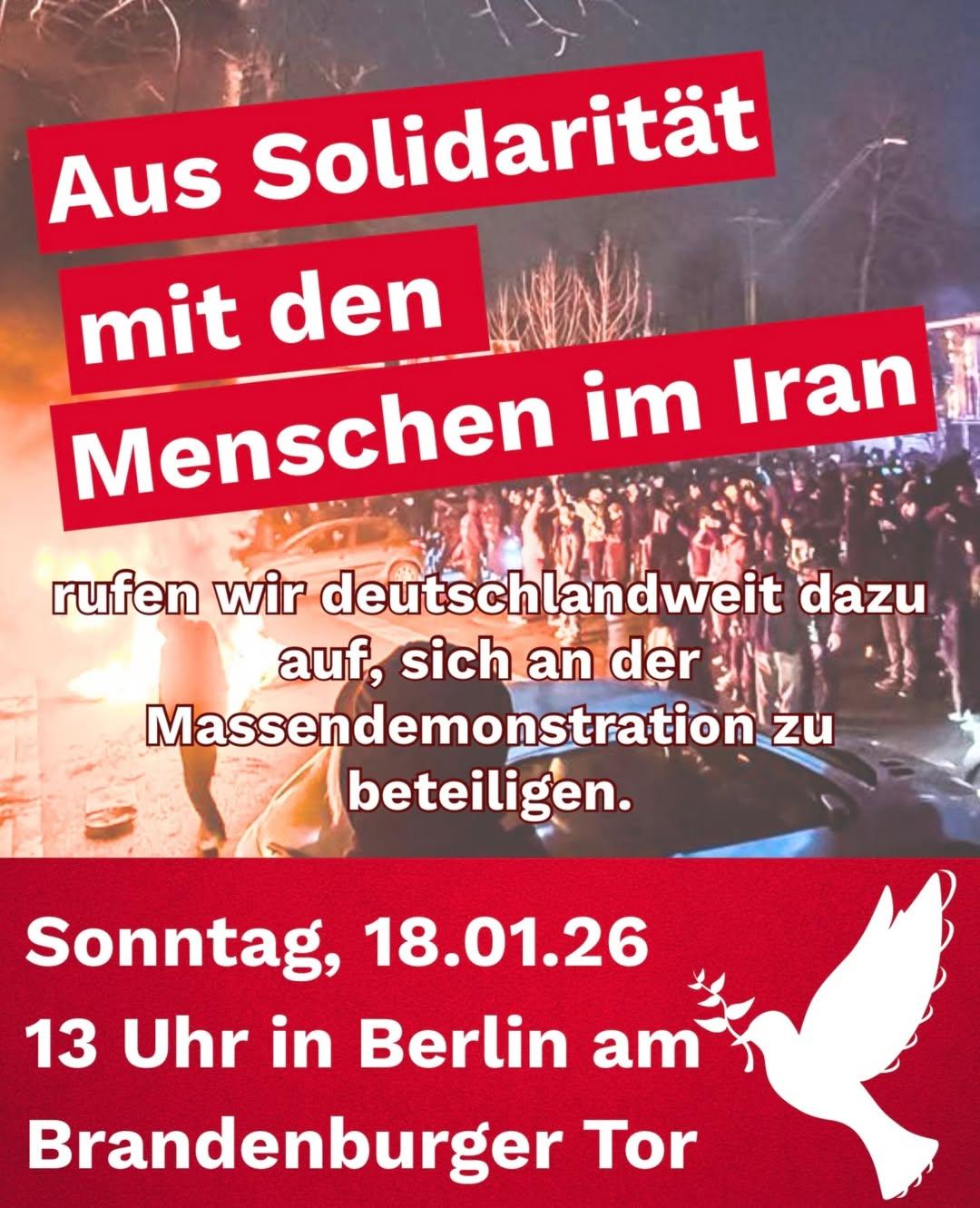 In Solidarität mit den Menschen im Iran rufen wir deutschlandweit dazu auf, sich am Sonntag, dem 18. Januar 2025, um 13 Uhr am Brandenburger Tor einer Massendemonstration anzuschließen.