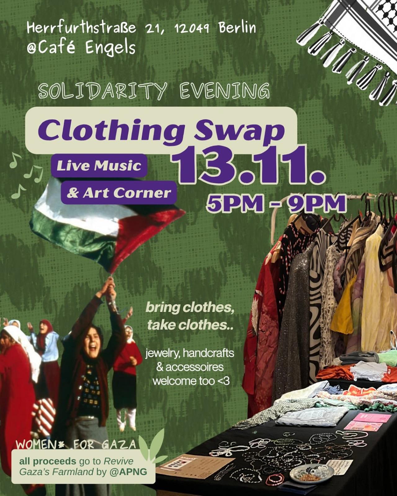 Kleidung mitbringen, Kleidung mitnehmen, Musik hören, Kunst teilen und Solidarität mit Gaza zeigen.