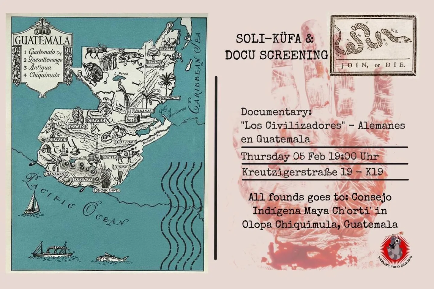 Migrant Food Dealers lädt euch zur nächsten SoliKüfa & Docu-Vorführung für die Maya-Gemeinschaft in Guatemala ein.