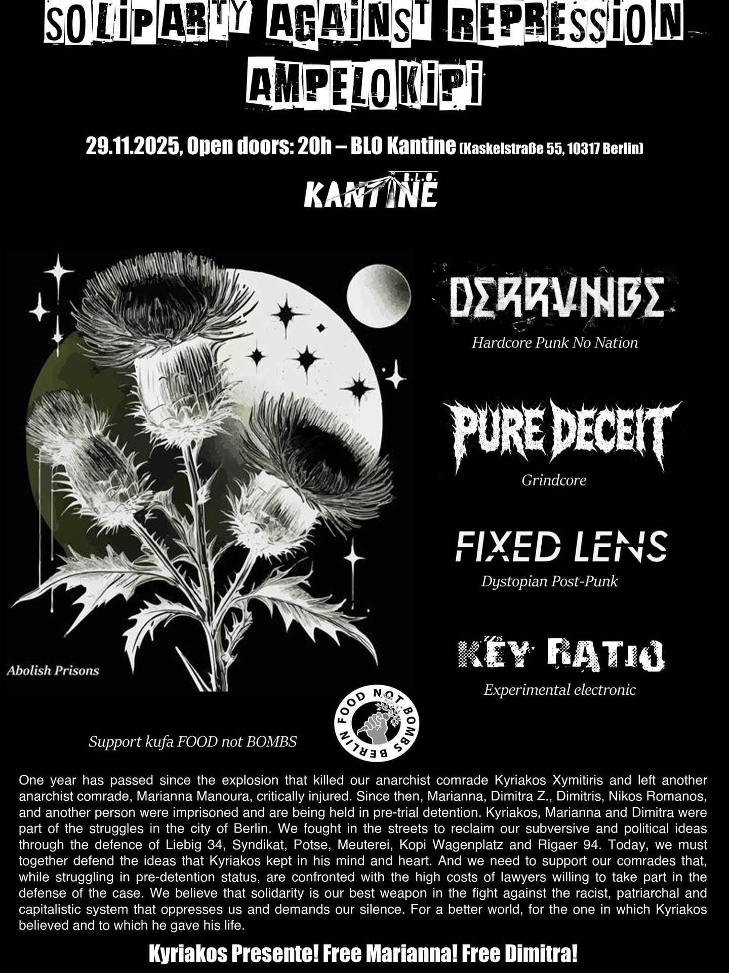 Heute müssen wir gemeinsam die Ideen verteidigen, die Kyriakos in seinem Kopf und seinem Herzen bewahrt hat. Und wir müssen unsere Genoss*innen unterstützen, die sich in Untersuchungshaft befinden und mit den hohen Kosten für Anwälte konfrontiert sind, die bereit sind, sich an der Verteidigung des Falles zu beteiligen.