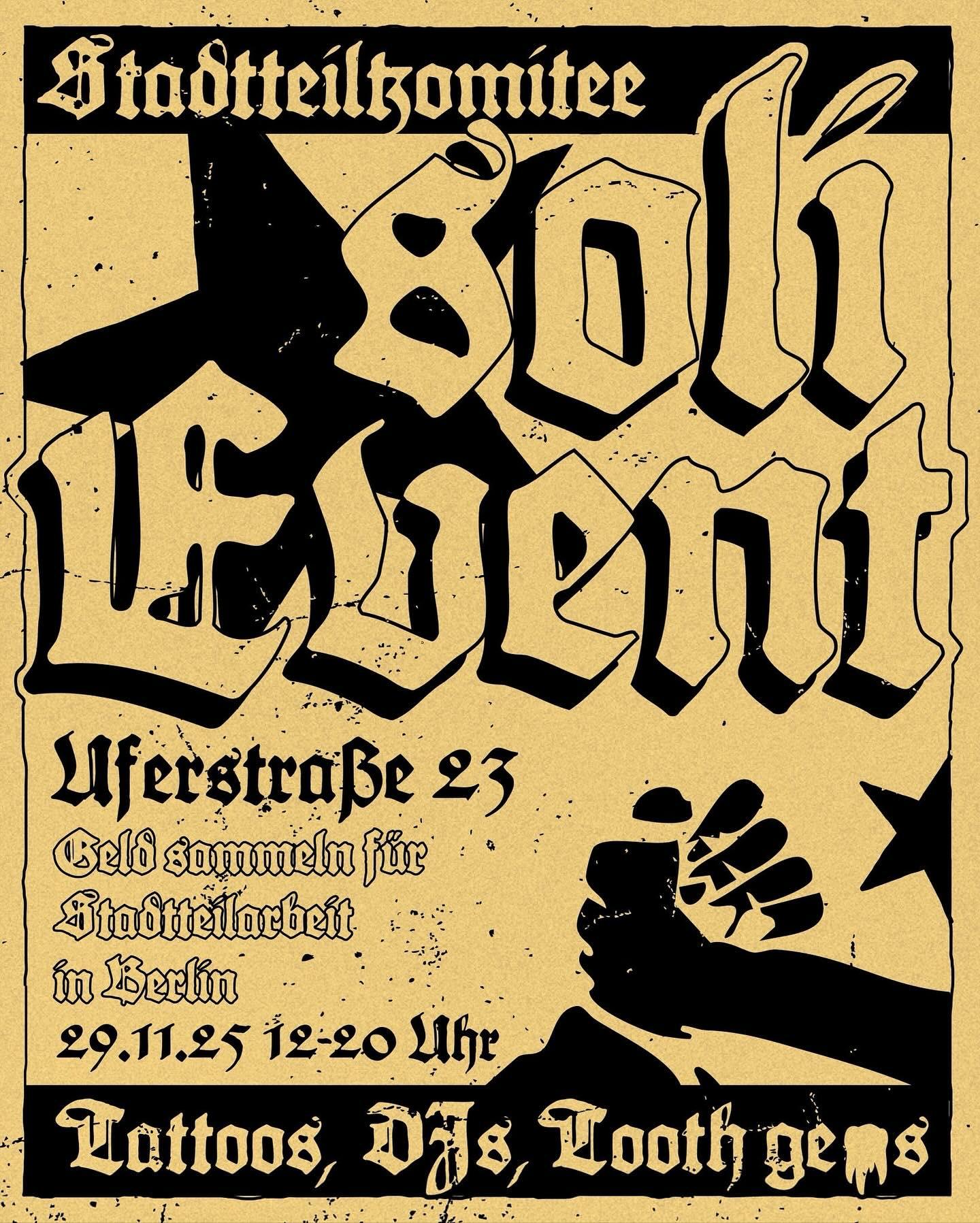 Um unsere revolutionäre Stadtteilarbeit in der Roten Ella zu finanzieren veranstalten wir vom Stadtteilkomitee Wedding am Samstag, den 29.11., von 12-20 Uhr ein tolles Soli-Event!