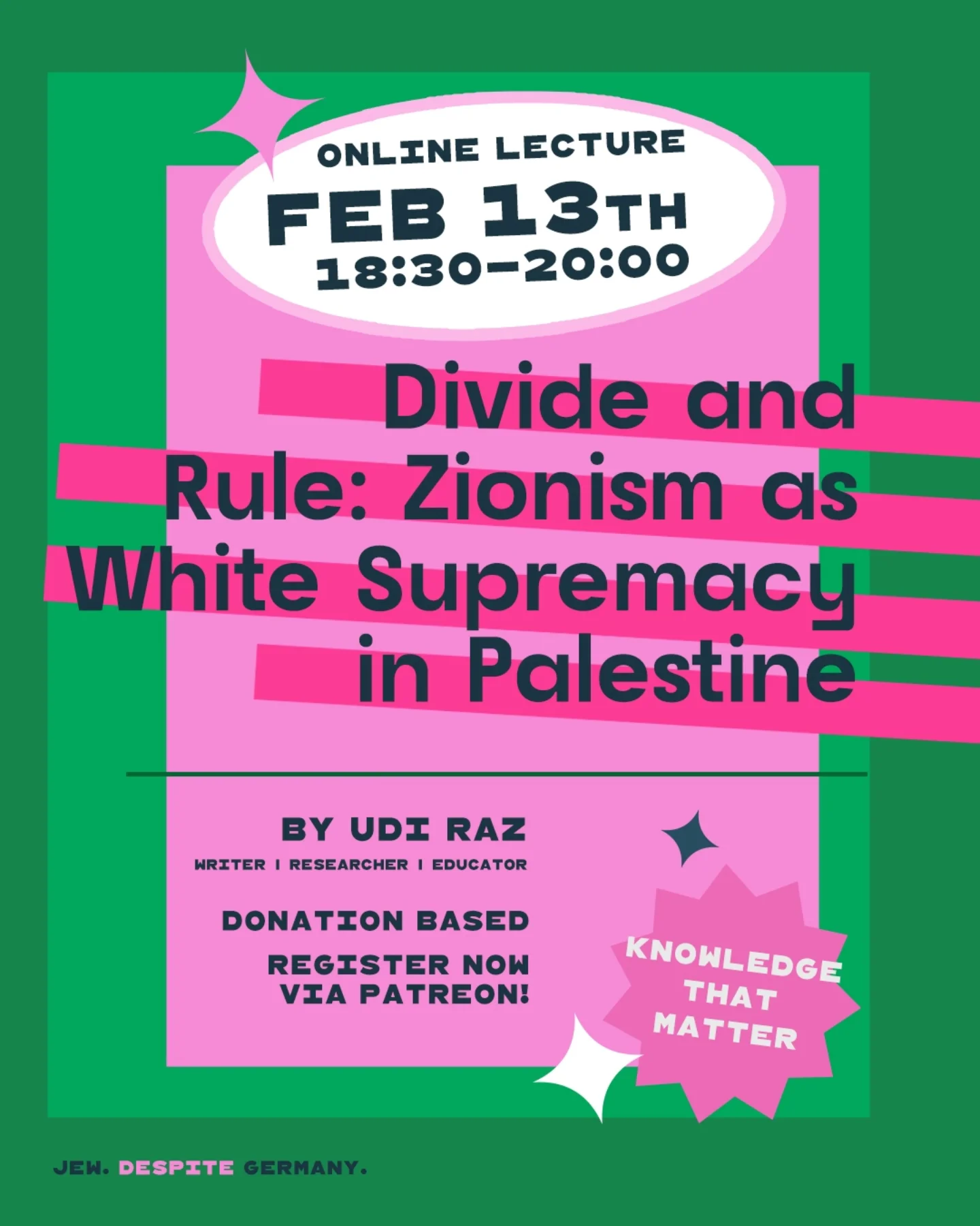 Nehmen Sie an diesem Live-Online-Vortrag teil und erfahren Sie, wie die Vorherrschaft der Weißen in Palästina in Form des sogenannten Staates Israel institutionalisiert wurde.