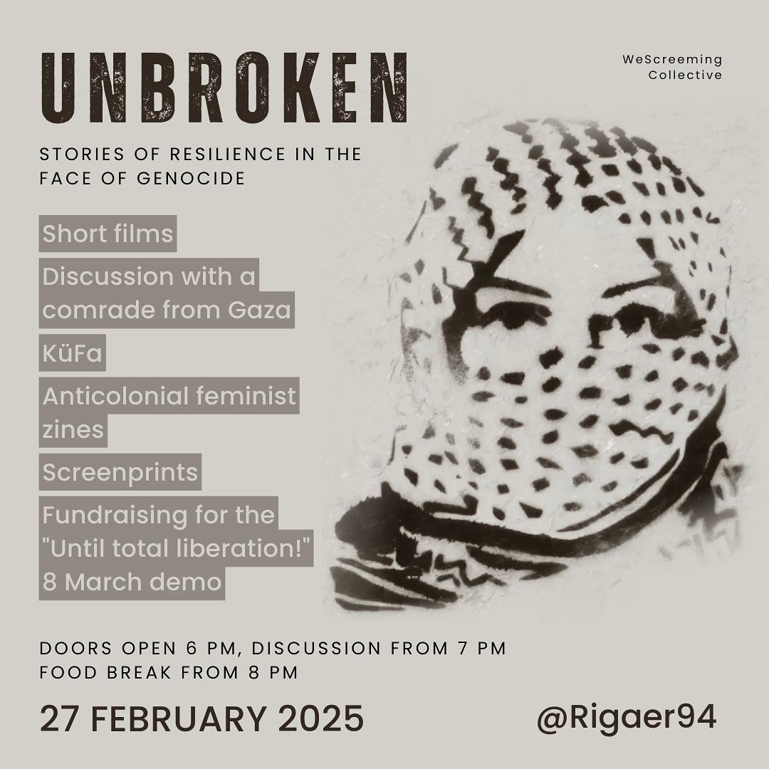 On Thursday the 27.02. at 18:00 we want to come together with you in Rigaerstr. 94 to talk about stories of resilience in the face of the ongoing genocide in Palestine!