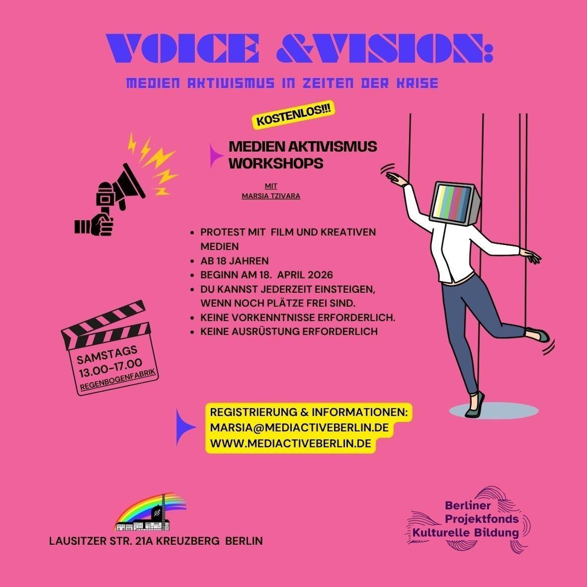 „Voice & Vision“ ist ein 8-monatiger Workshop (Beginn 18.04.) für alle jungen Menschen ab 18 Jahren, der sich mit der Rolle von Film und Medien als Instrumente des Aktivismus auseinandersetzt.