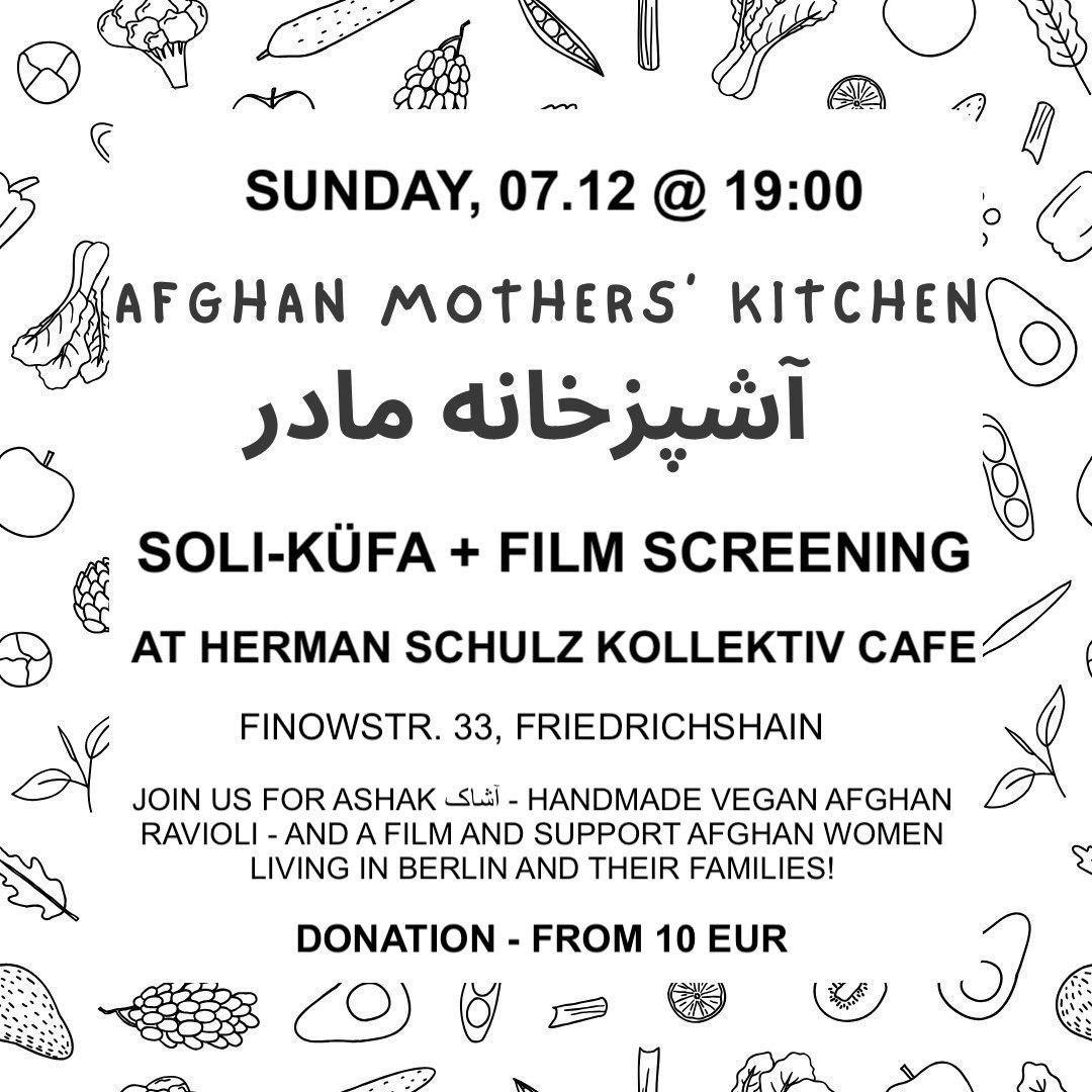 Come to a solidarity dinner and film screening with Afghan Mothers‘ Kitchen at Herman Schulz Kollektiv Cafe on 7 December at 7 p.m.